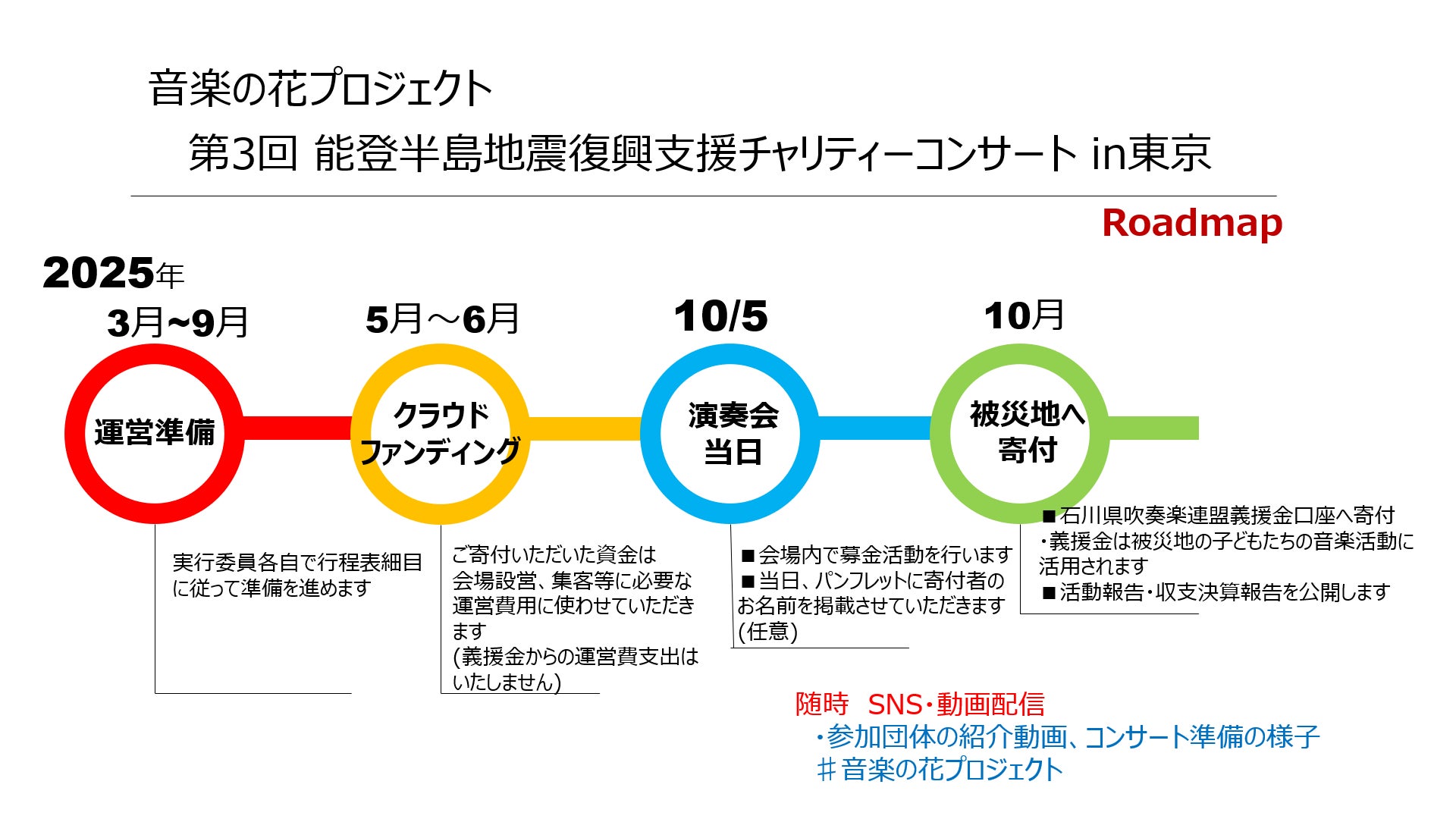 現在、広報、音楽プログラムの構成、関係者との連携など、工程表に従い着実に計画を進めており、コンサートの成功に向けて全力を尽くしています。
