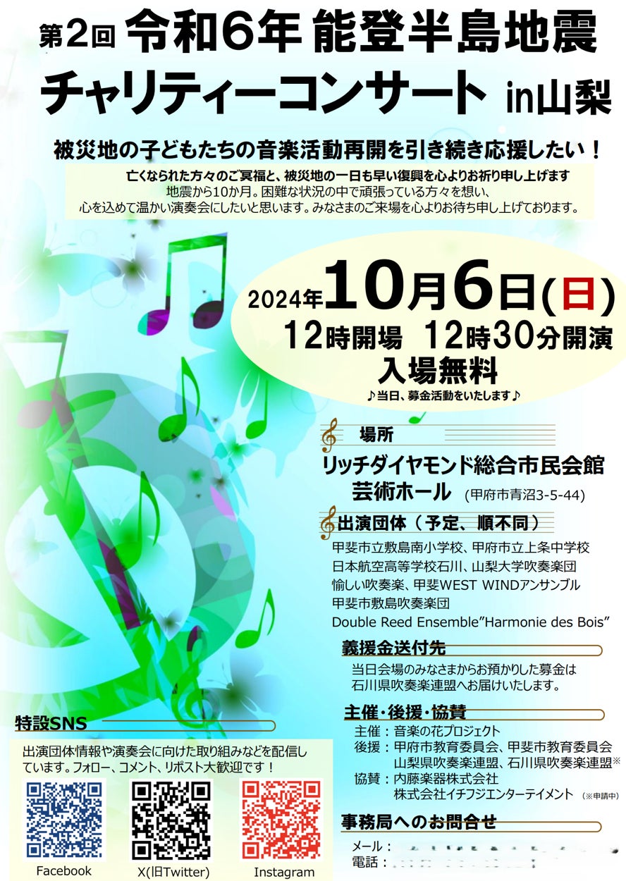 私たちは2024年2月・10月に山梨県内で2回の能登半島地震復興支援チャリティーコンサートを開催の企画・運営を行いました。
