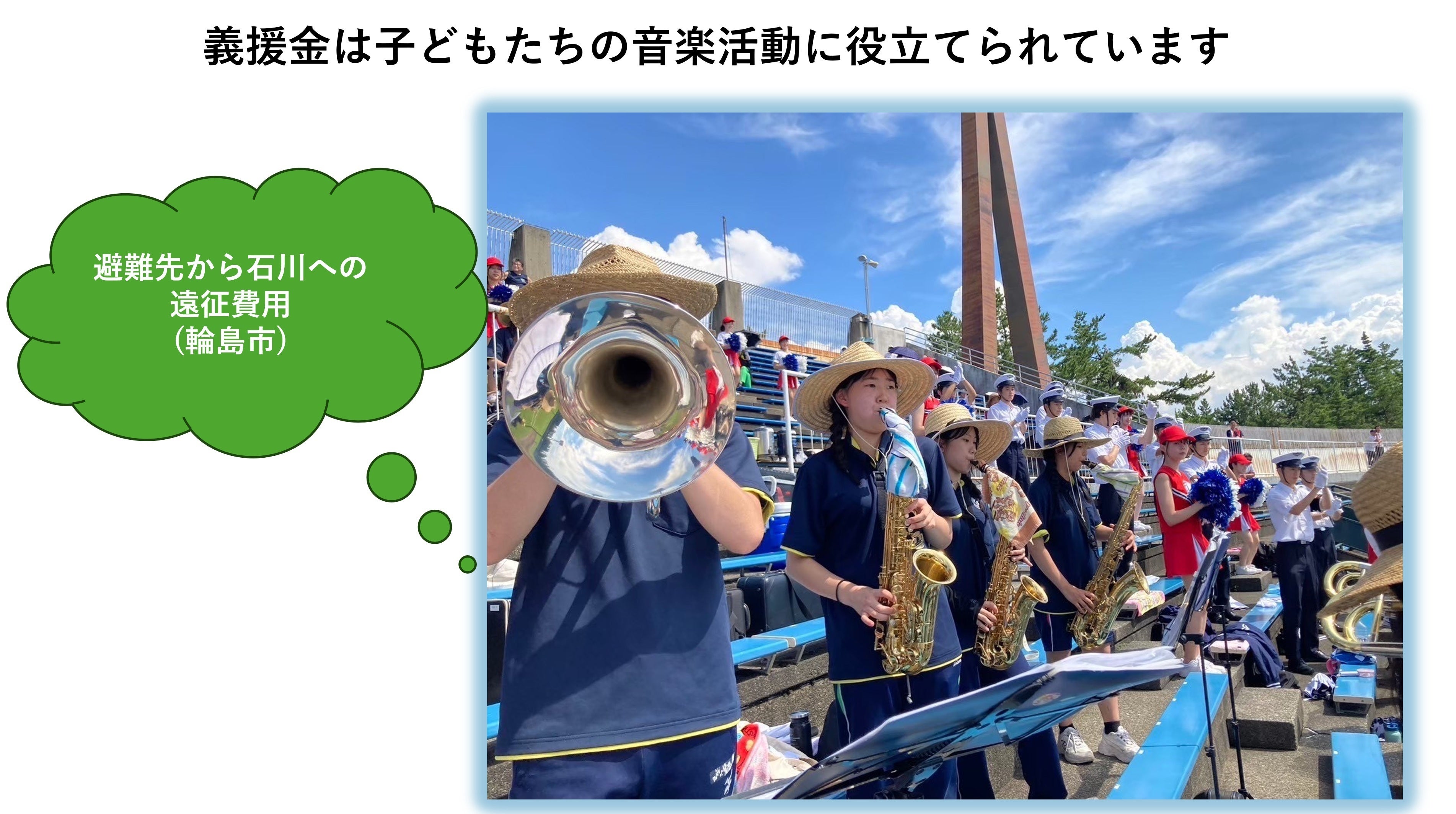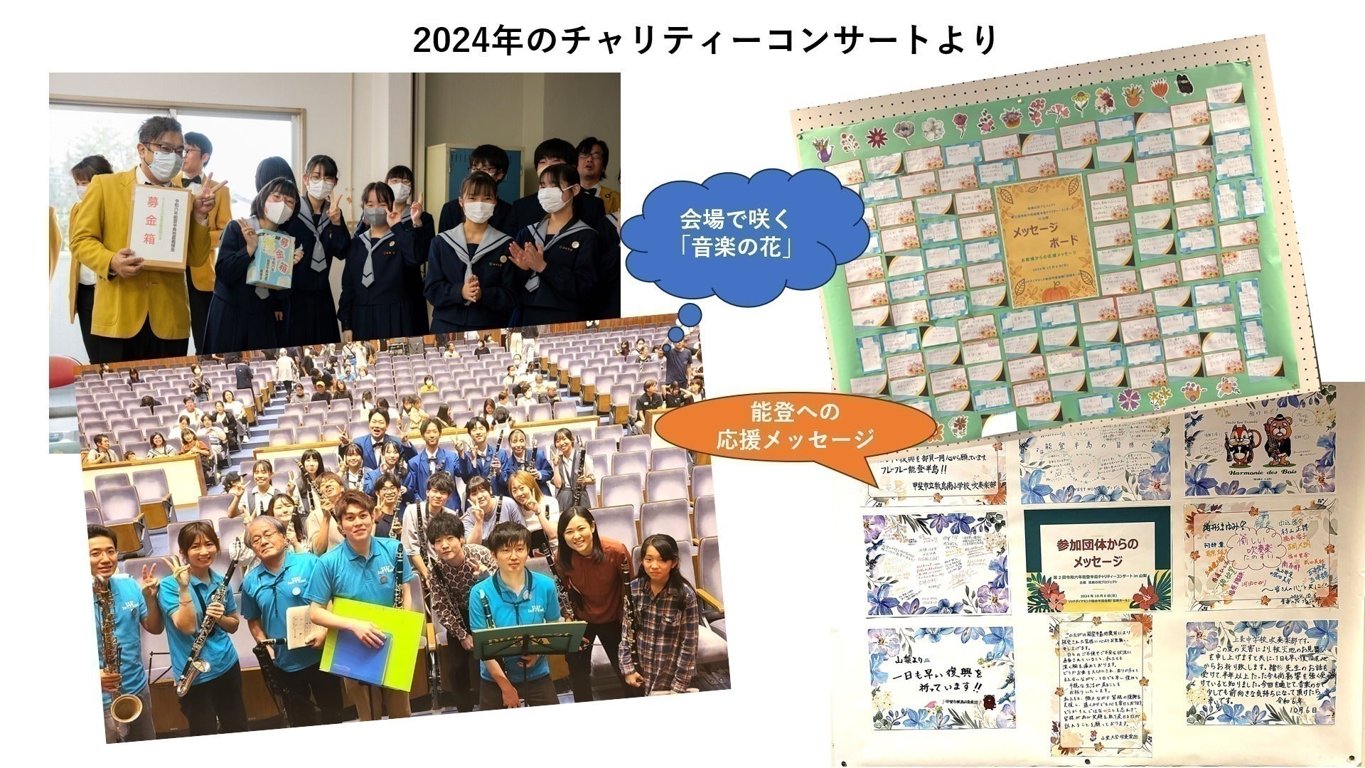 全国の音楽する団体・個人から寄せられる義援金は、石川県吹奏楽連盟を通じて現在も被災地に分配されています。