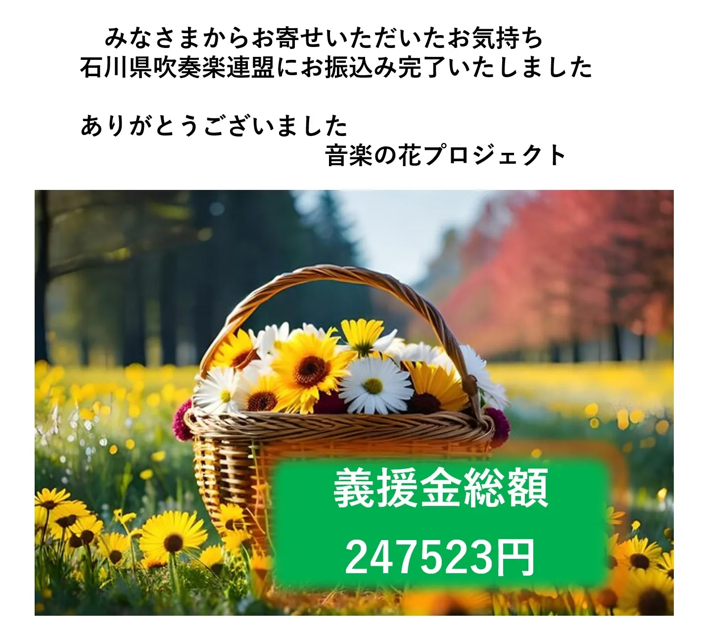 ご支援金から、銀行手数料、硬貨整理手数料を使途させていただき、全額を石川県吹奏楽連盟義援金特設口座へお振込みを完了いたしました。