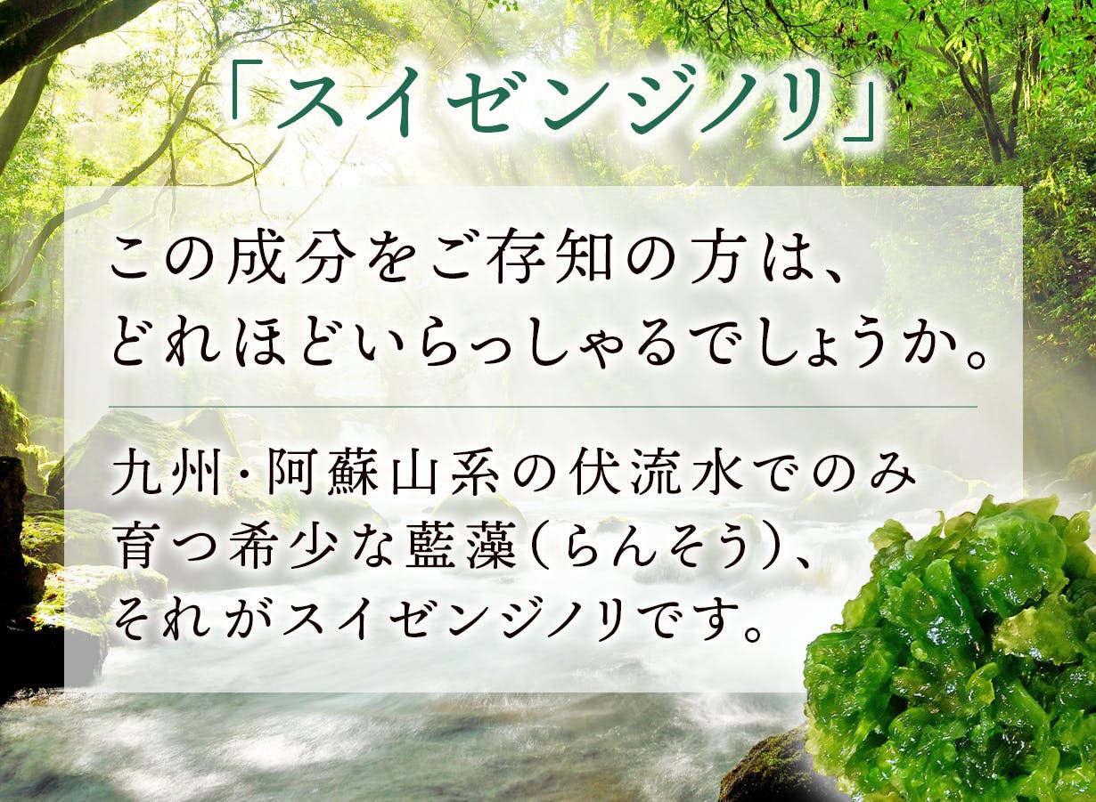 美容液も、熊本・阿蘇の伏流水が育んだスイゼンジノリの力を活かした、必要な成分だけ。