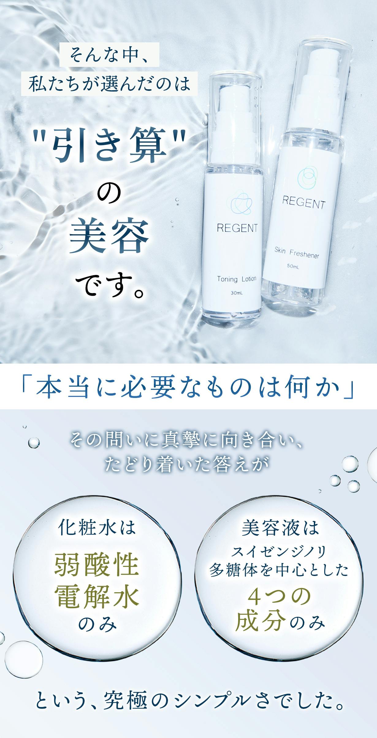 その問いに真摯に向き合い、たどり着いた答えが、化粧水は弱酸性電解水のみ、美容液はスイゼンジノリ多糖体を中心とした4つの成分の(※7)という、究極のシンプルさでした。