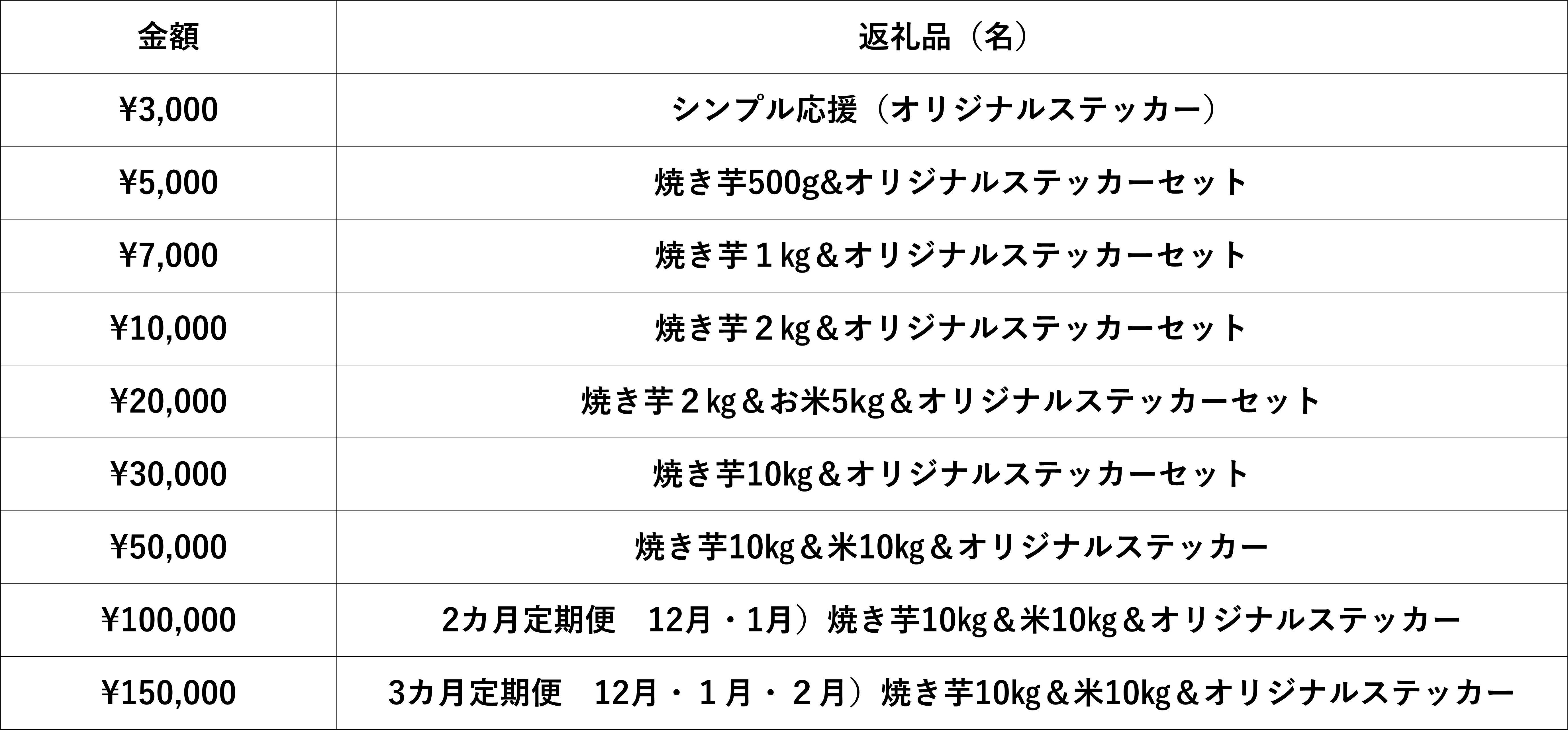3)募集金額を超過した資金に関しては、さつまいも出荷調整に必要な農機(洗浄機、選果機等)の購入の他、規模拡大の計画を早め1)の焼成機の追加購入、来期に向けた休耕地開拓等への費用にすべて使用させていただきます