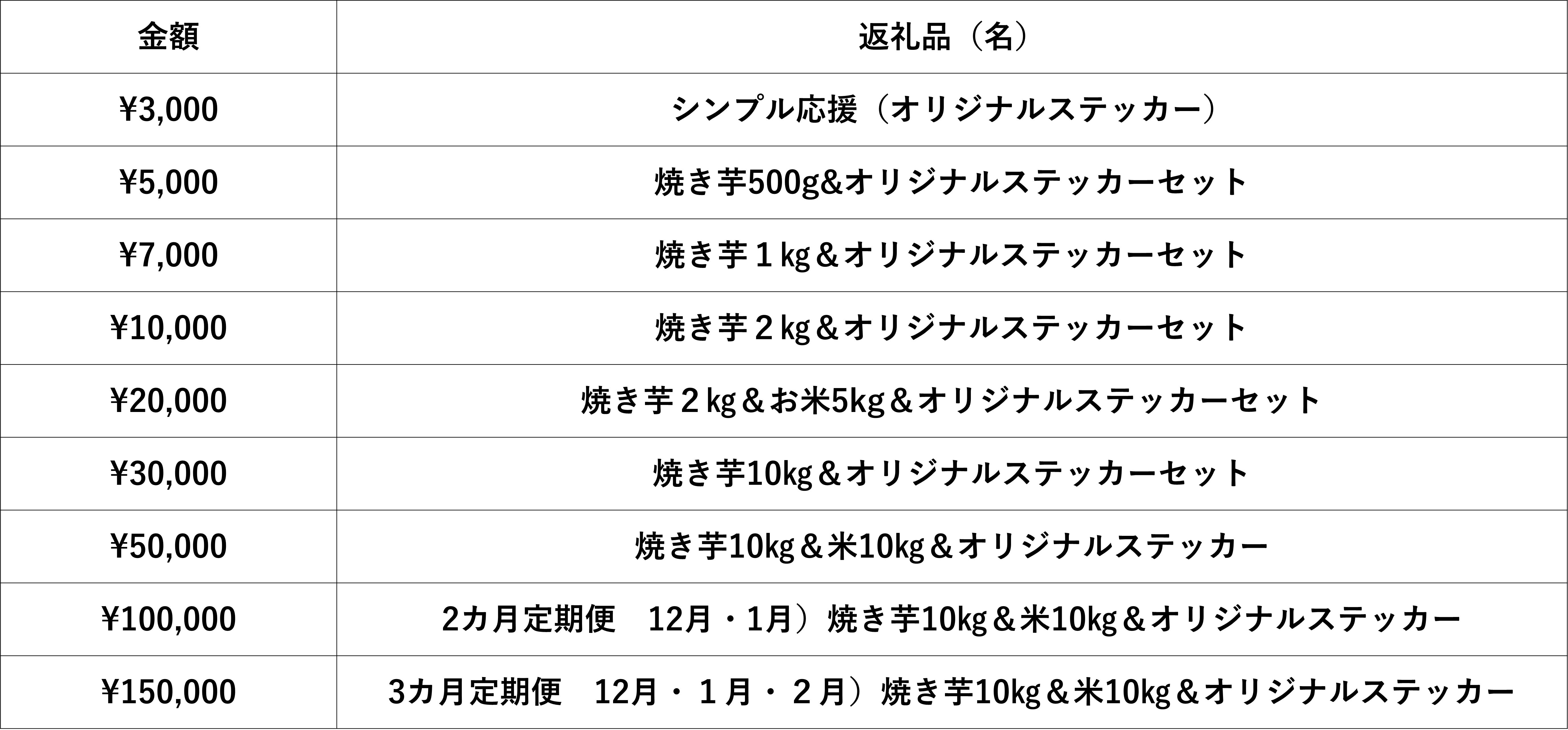 3)募集金額を超過した資金に関しては、さつまいも出荷調整に必要な農機(洗浄機、選果機等)の購入の他、規模拡大の計画を早め1)の焼成機の追加購入、来期に向けた休耕地開拓等への費用にすべて使用させていただきます