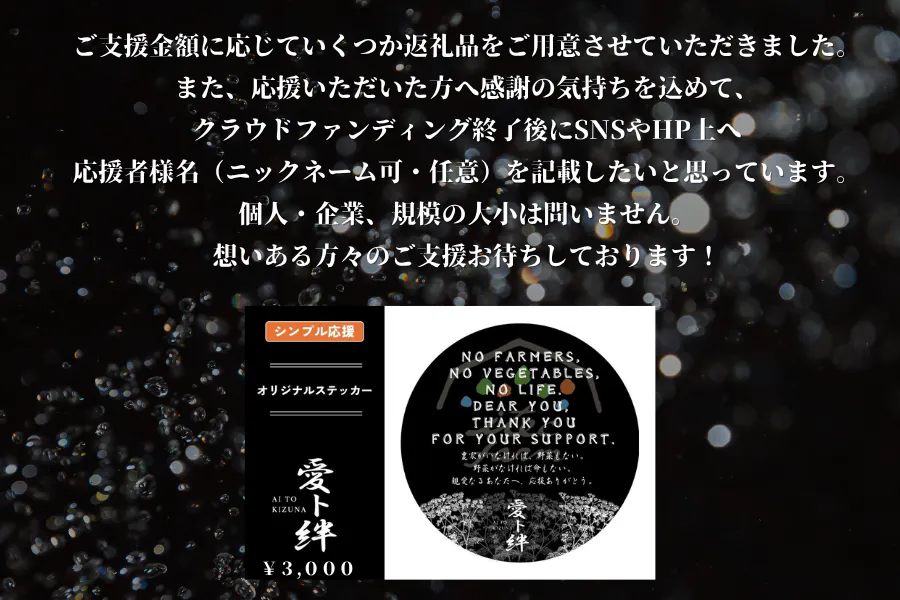 そんな想い溢れる人と農家を繋げるためのハブとしてこのプロジェクトを機能させることで、多くの人たちを巻き込み、みんなで一緒に農業を支えていくプロジェクト、ブランドにしていきたいと考えています!