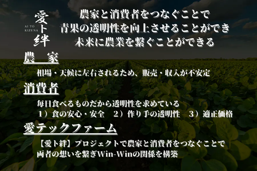 この「愛ト絆」は農家と消費者をつなぎ、「未来に繋ぐ農業」を実現するプロジェクトにしていきます。