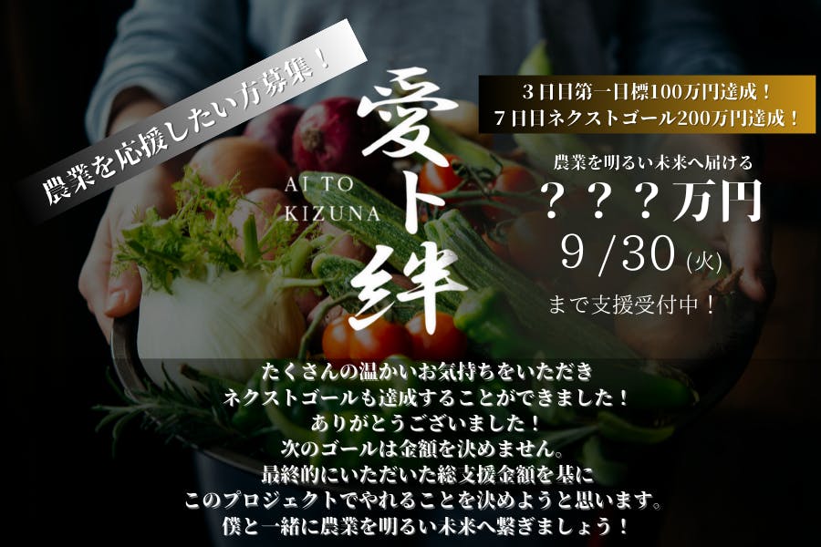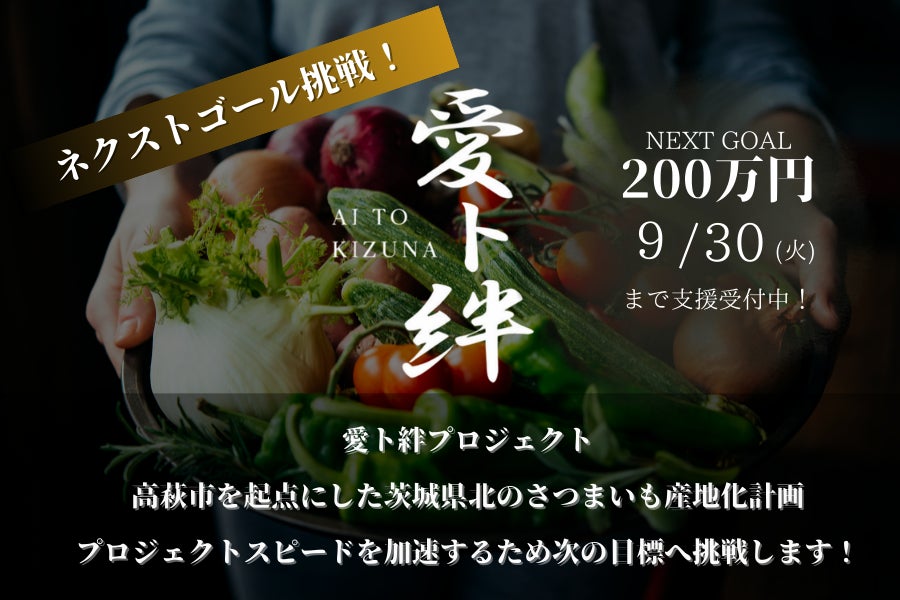 2025/09/03 15:50こんにちは!愛テックファームの松本です。愛ト絆プロジェクト。クラウドファンディングスタートから3日目。第1目標である100万円を達成しました!親友や知人などの身内の他、普段から愛テックファームを支えてくれる温かい愛テックファンの方々、茨城県を支えている企業様など、温かい気持ちを持つたくさんの素敵な人たちに支援いただき、おかげさまで開始53時間という短い期間で第一目標を達成することができました!物価高の現情勢にも関わらず、貴重なお金を愛テックファームへご支援いただき身が引き締まる思いと共に、いただいたひとつひとつの支援や応援メッセージに勇気をいただきました。僕が掲げる目標の1つ。高萩市を起点にした茨城県北のさつまいも産地化。その実現に向け活動や取り組みを全身全霊で進めて参ります。今回のご支援結果を踏まえ今後計画を前倒し、プロジェクトスピードを加速させるためネクストゴール200万円に挑戦させていただきます。低温熟成工程に必要な設備の他、産地化=大量生産に向けた生さつまいもの洗浄機等の設備投資、来年度の高萩市内で愛芋AIIMO紅はるかを生産する生産者支援等に使用させていただきます。愛ト絆プロジェクトで消費者と生産者を繋ぐハブになる。その可能性が今回皆様からのご支援で少しだけ先が見えました。引き続き農業の明るい未来に向け、温かいお気持ちお待ちしております!株式会社愛テックファーム代表取締役 松本剣より もっと見る