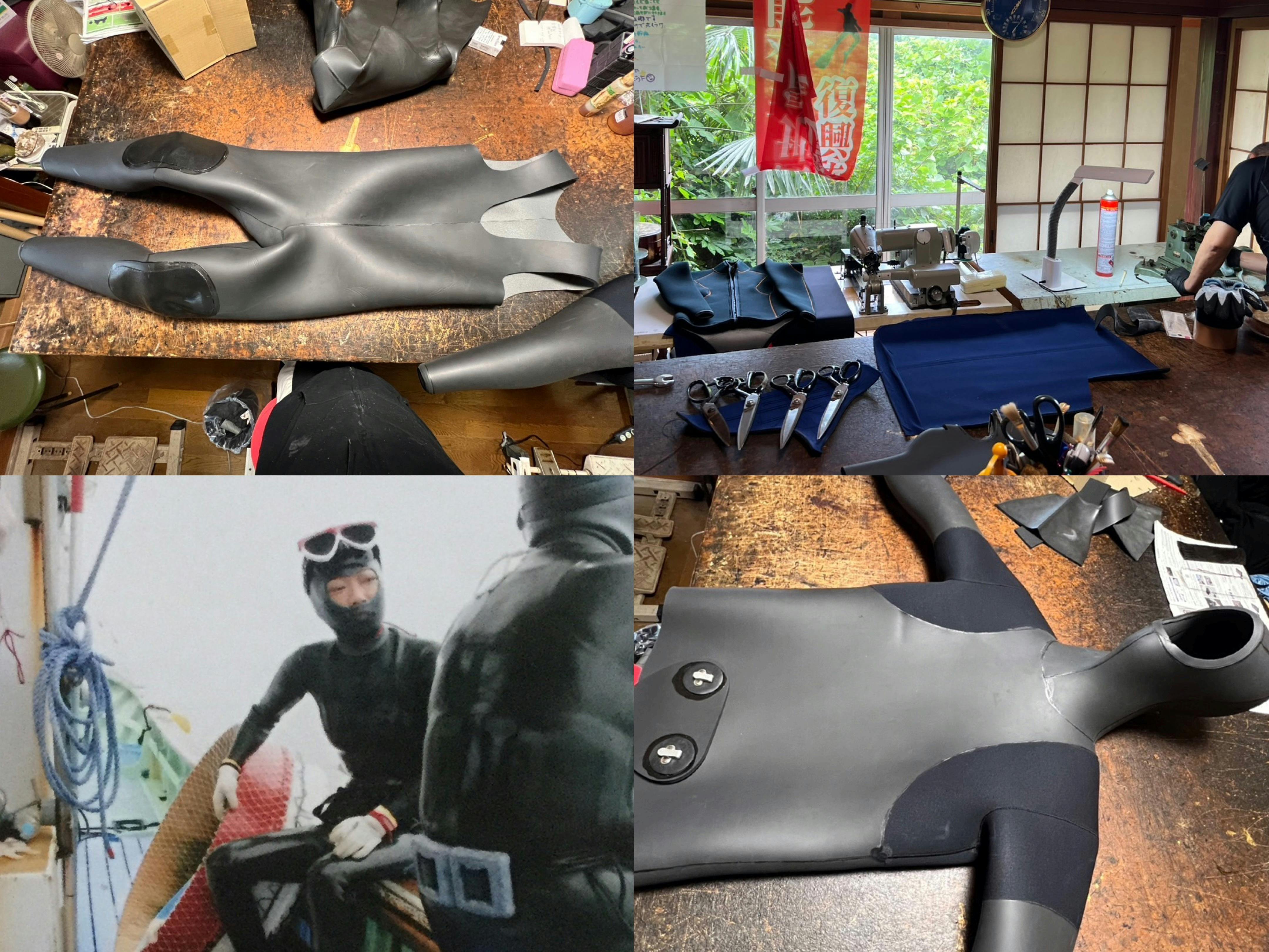 被災で崩れた作業場を再建し、一人ひとりの体型に合わせたウエットスーツの製作を再開します。これは、海に潜るために欠かせない“命を守る装備”です。
