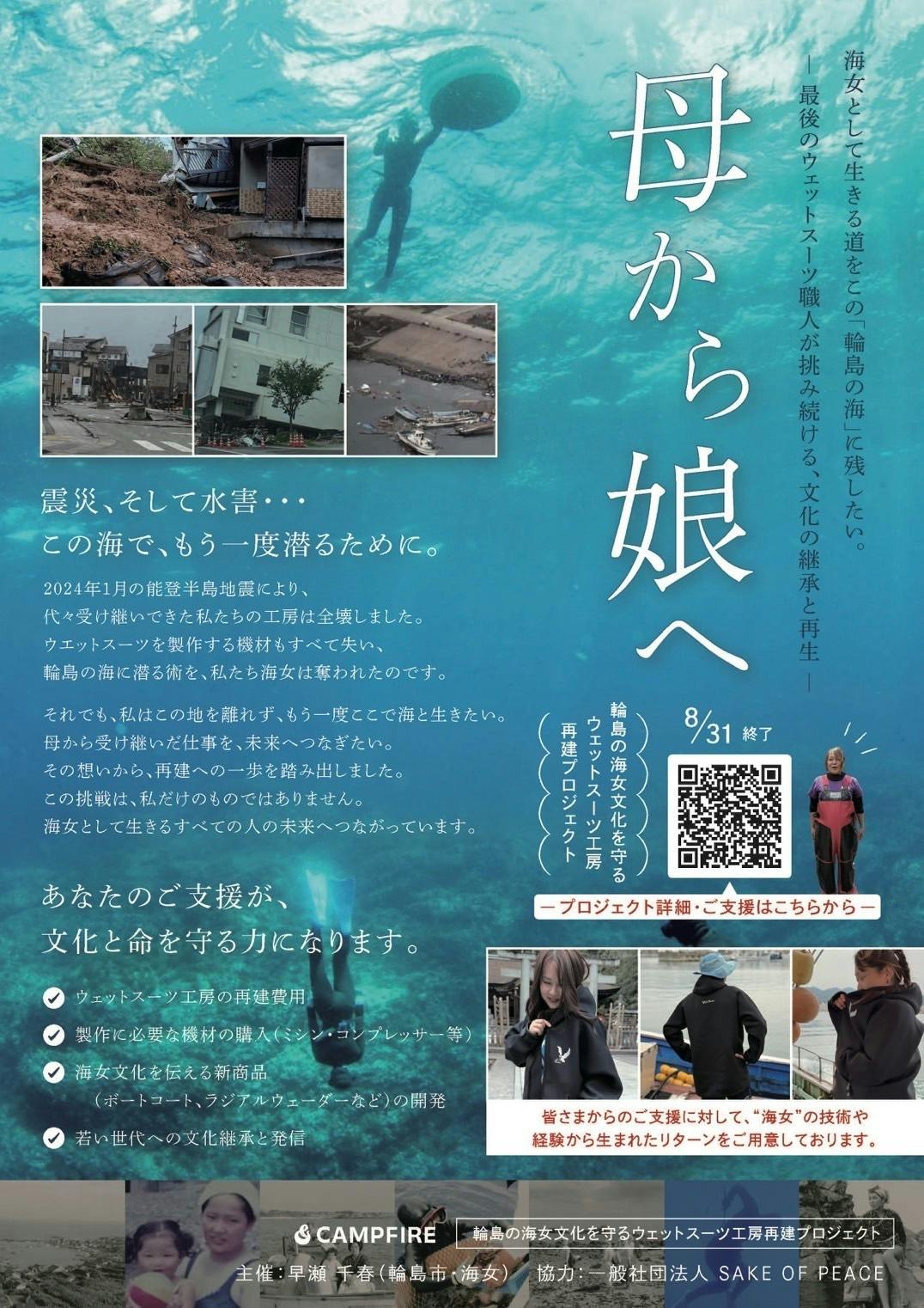 それでも私は、輪島を離れることなく、もう一度この海に戻りたいと思っています。母から受け継いだ仕事と、海女の伝統技術を、この地で繋いでいきたい。そのために、皆さんのお力をお借りできないでしょうか。
