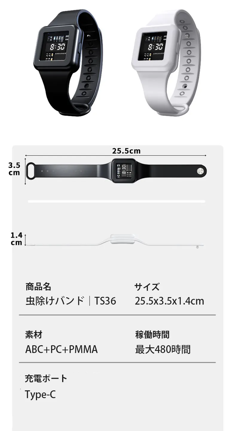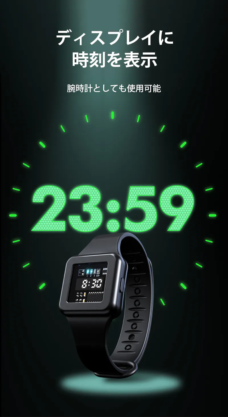 時刻デジタル表示機能を搭載しており、蚊除けと同時に腕時計として使用することができます。