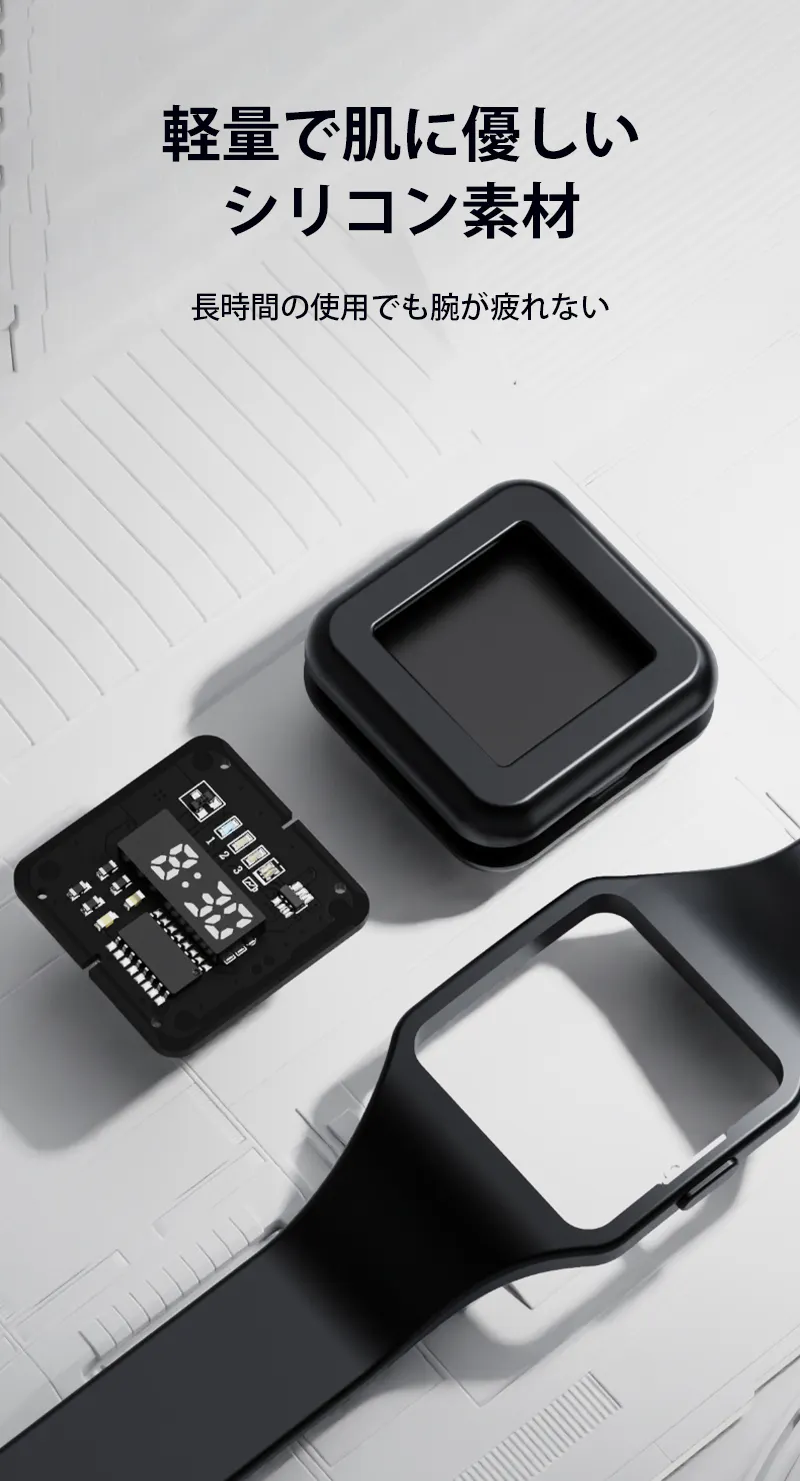 バンドには軽量で肌に優しいシリコンを使用しており、長時間の使用でも腕が疲れにくく、また手首にしっかりフィットするので快適です。
