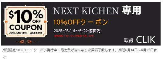本日は開始日よりスタートダッシュ特典で発行させて頂きておりました、NEXT KITCHEN全関連商品に対する10%OFFクーポンが間もなく終了致しますので皆様と共有させて頂きます。