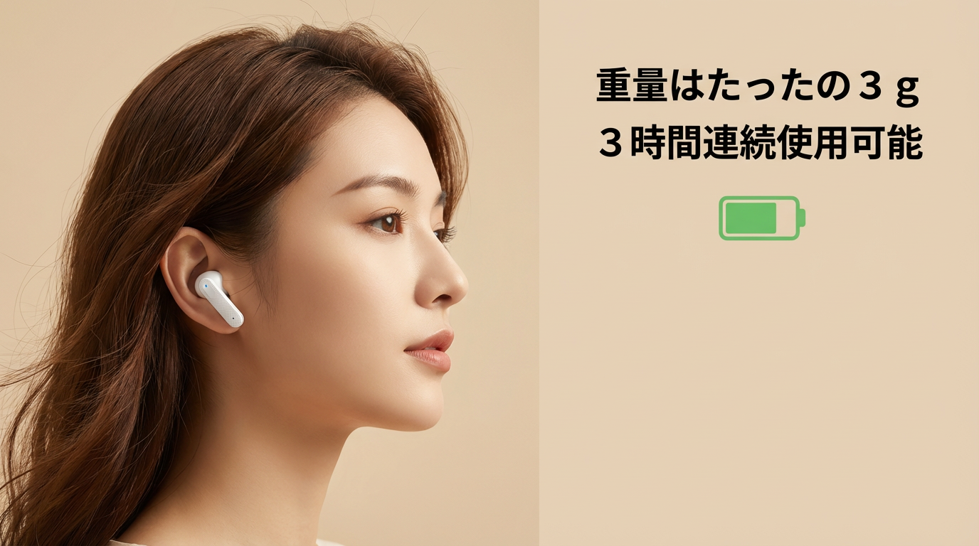 Fineblue C10Aeはノイズキャンセリング機能を搭載しながらも、片耳わずか3gの軽量設計を実現。長時間装着でも耳への負担を最小限に抑えます。