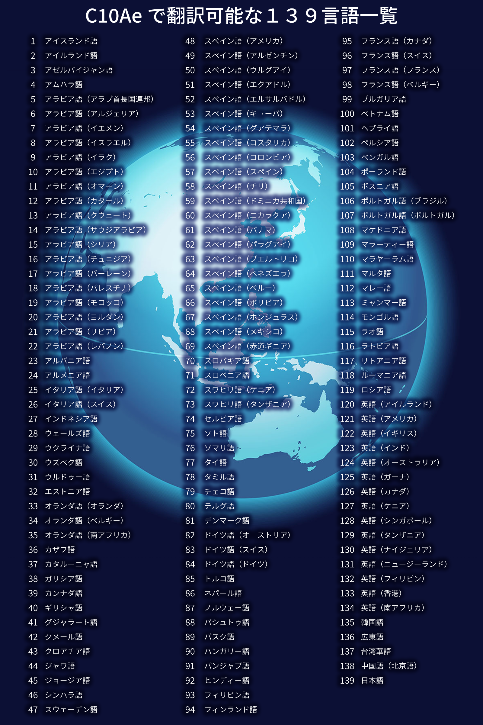 Fineblue C10Aeが翻訳できる言語数はなんと139言語。英語・フランス語・スペイン語・中国語・韓国語といった日本で使用頻度の高い言語はもちろん、タイ語やアラビア語など世界各地の言語にも対応。ビジネス出張から海外旅行まで、あらゆるシーンで活躍します。