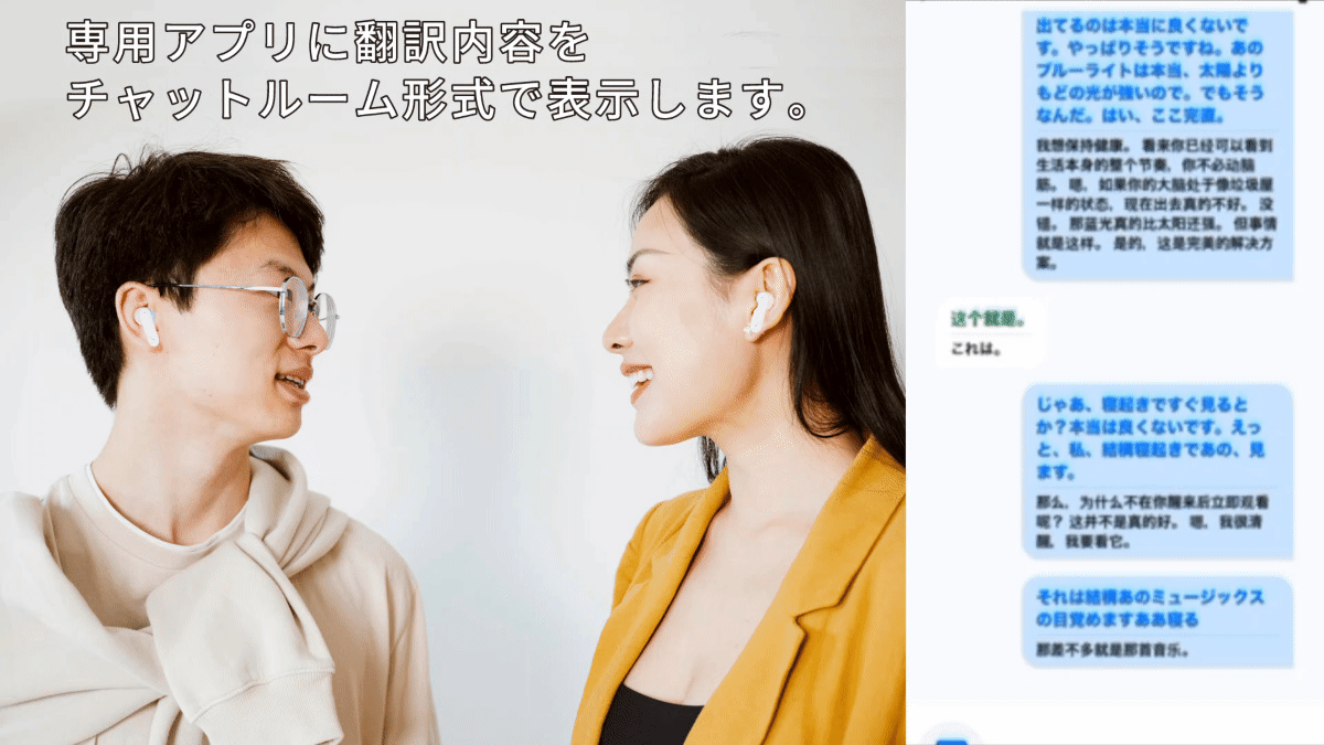 二人の会話内容はスマホのモニターにチャットルームのように、双方の言語でテキスト化してリアルタイム表示。翻訳の内容を目でも確認しながら、安心してコミュニケーションが取れます。