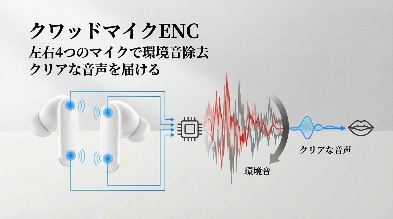 ANC(アクティブノイズキャンセリング)、ENC(環境ノイズキャンセリング)、そしてDSP(デジタル信号処理)を搭載。最大35dBの騒音カット を実現し、駅のホームや繁華街でも、相手の声だけをクリアに届けます。