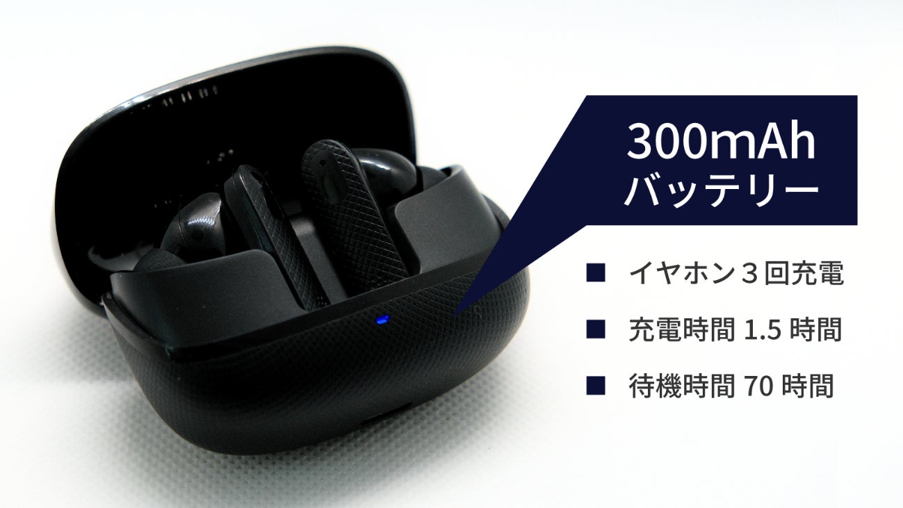 充電ケースはイヤホンをさらに3回フルチャージできる大容量設計で、最大70時間のスタンバイを実現。ケースにイヤホンを収納するだけで自動的に充電が始まり、万が一電池切れでも1.5時間でフル充電完了。海外旅行や長期出張でも電源の心配なく使い続けられます。