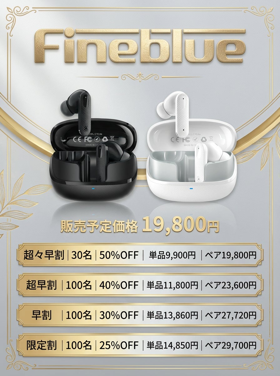 * Fineblue C10Ae 本体、専用充電ケース、USB Type-C ケーブル、日本語取扱説明書、保証書(6ヶ月)