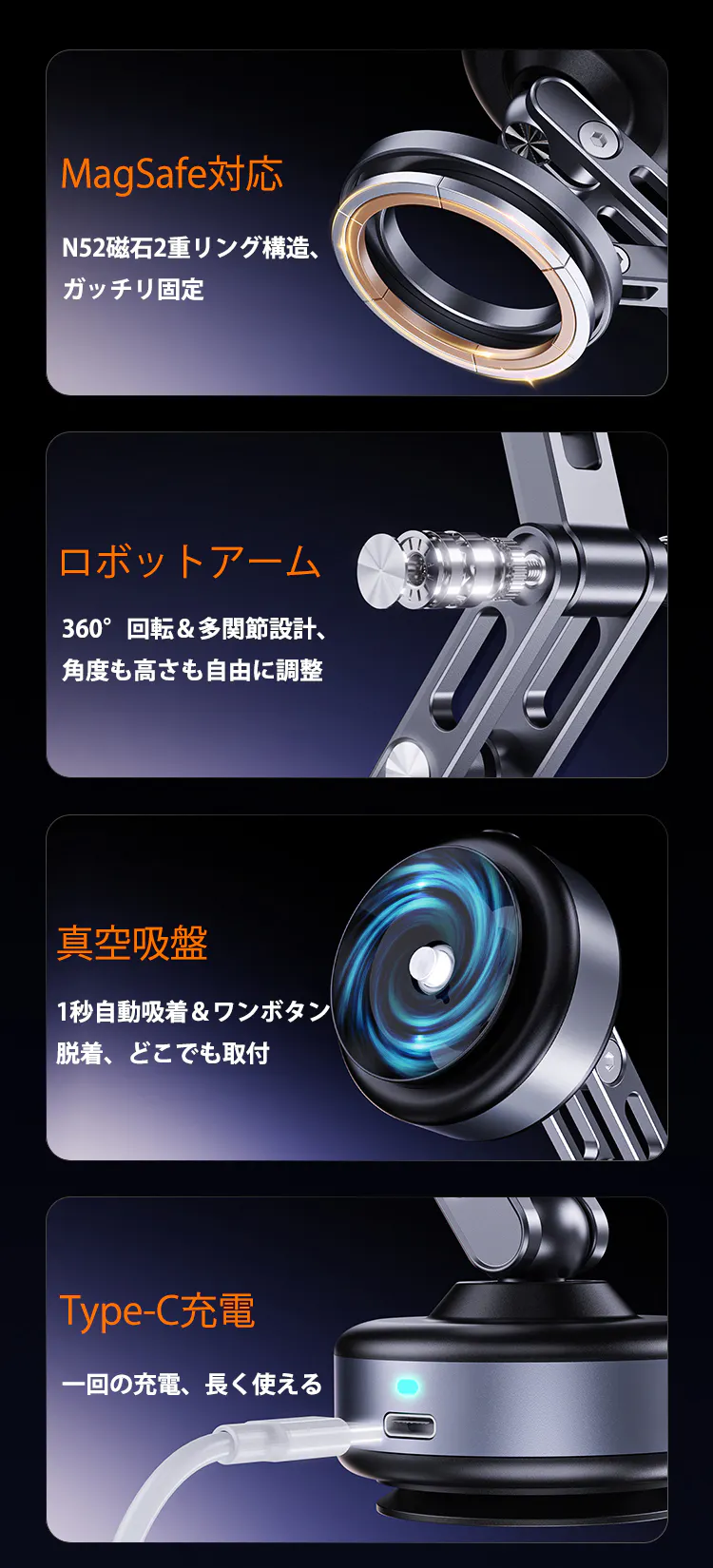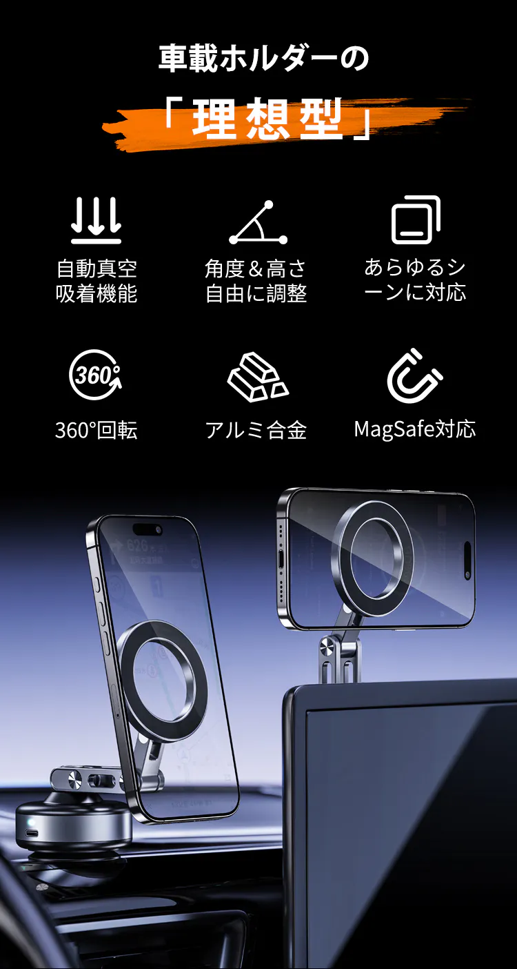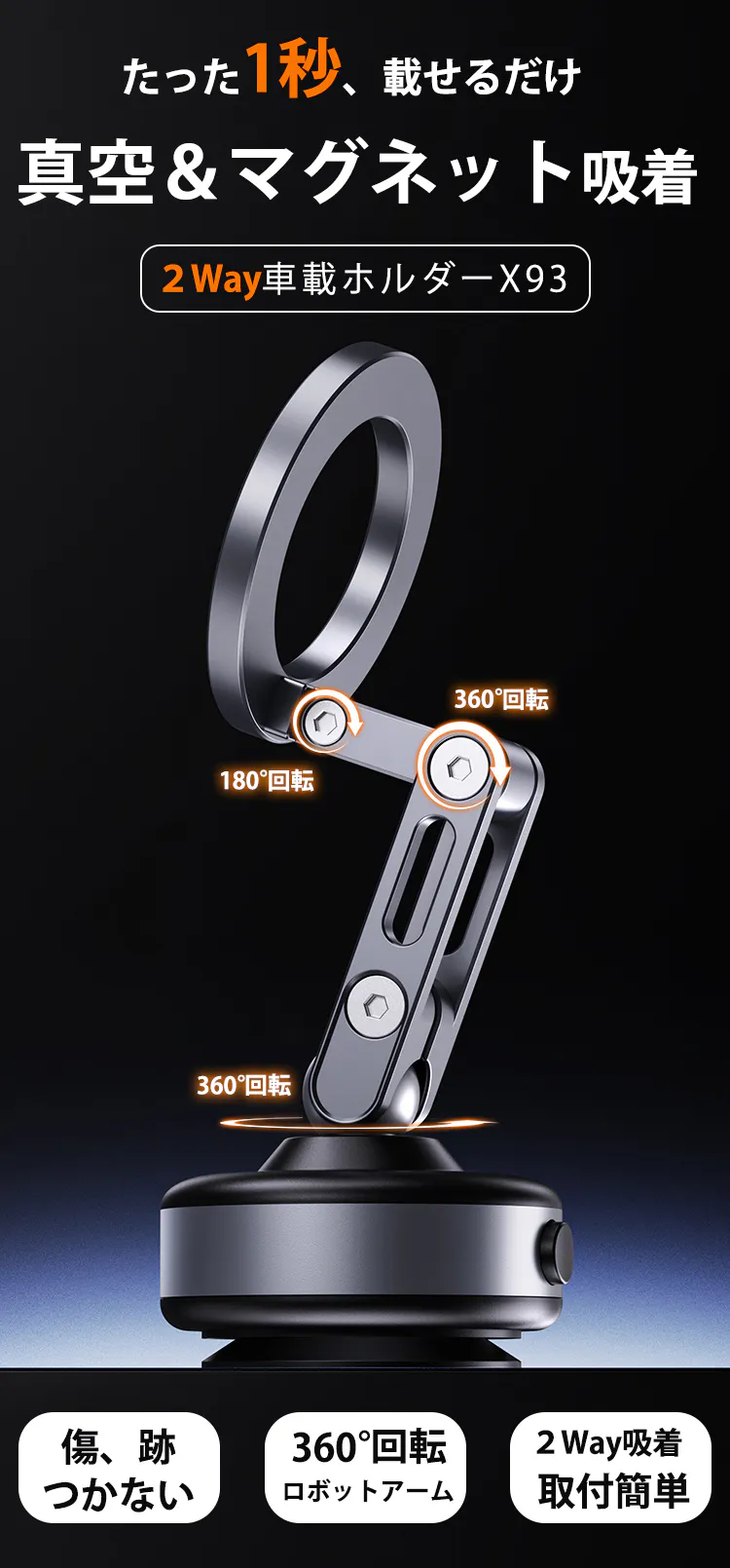PJ開始!置くだけ、1秒で真空&磁気吸着!角度&高さ調整自由な車載ホルダーX93
