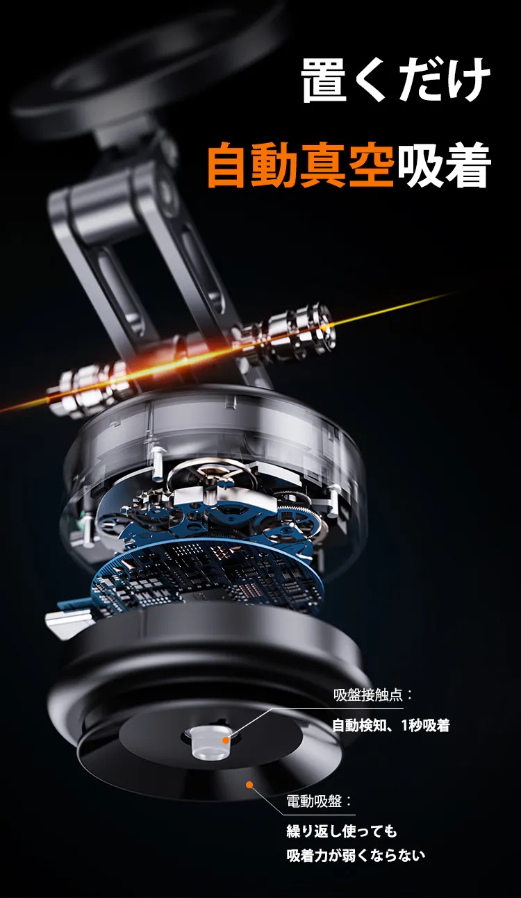 モーターの力により、わずか1秒で吸盤内が真空状態に!吸盤の凸部分が平らな表面に置かれると、自動で検知し、すぐに吸引が始まり、強力に固定されます。