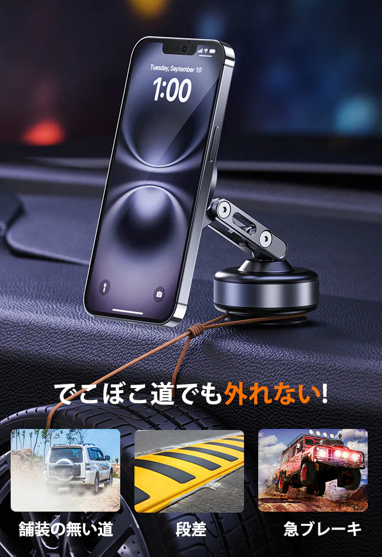 その吸着力は驚くほど高く、運転中のカーナビとしても非常に安定しており、でこぼこ道でも落ちにくいです。