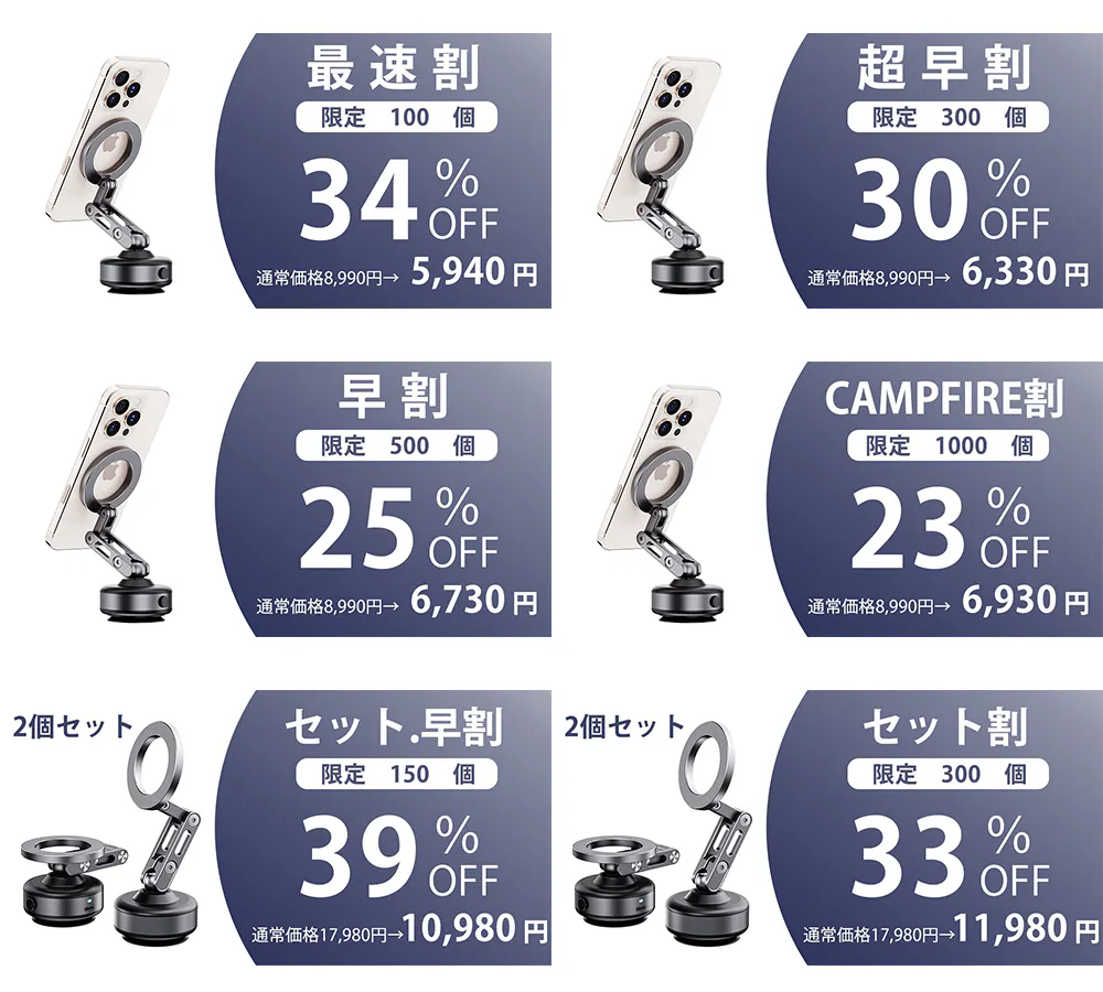 2025/04/28 11:17お世話になります。株式会社SUNONEでございます! この度は数あるプロジェクトの中から弊社を選んで頂きまして誠にありがとうございます。この度は【車載ホルダーX93】の第二弾をCAMPFIREにて公開させていただきました!ご支援はこちらで↓ https://camp-fire.jp/projects/845376/view目標金額達成に向けて頑張りますので、よろしくお願いいたします! もっと見る