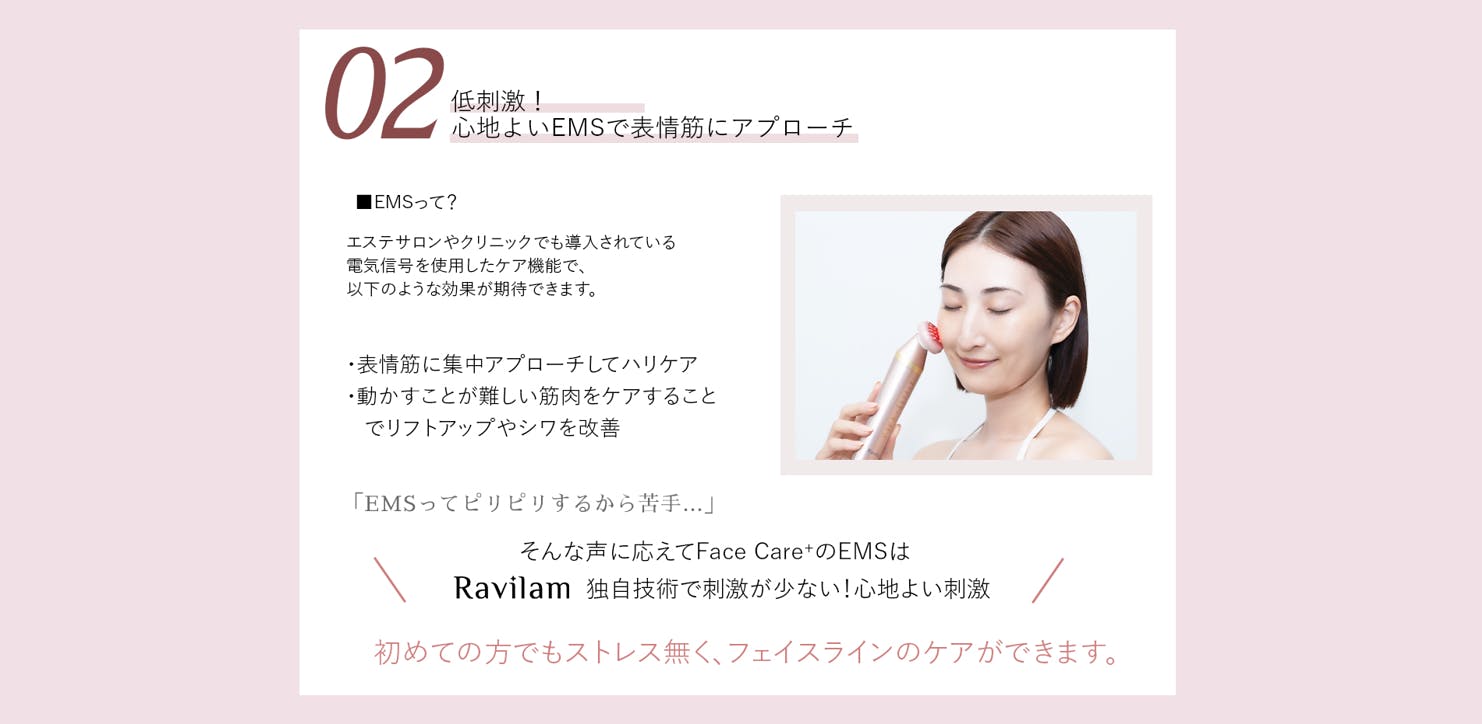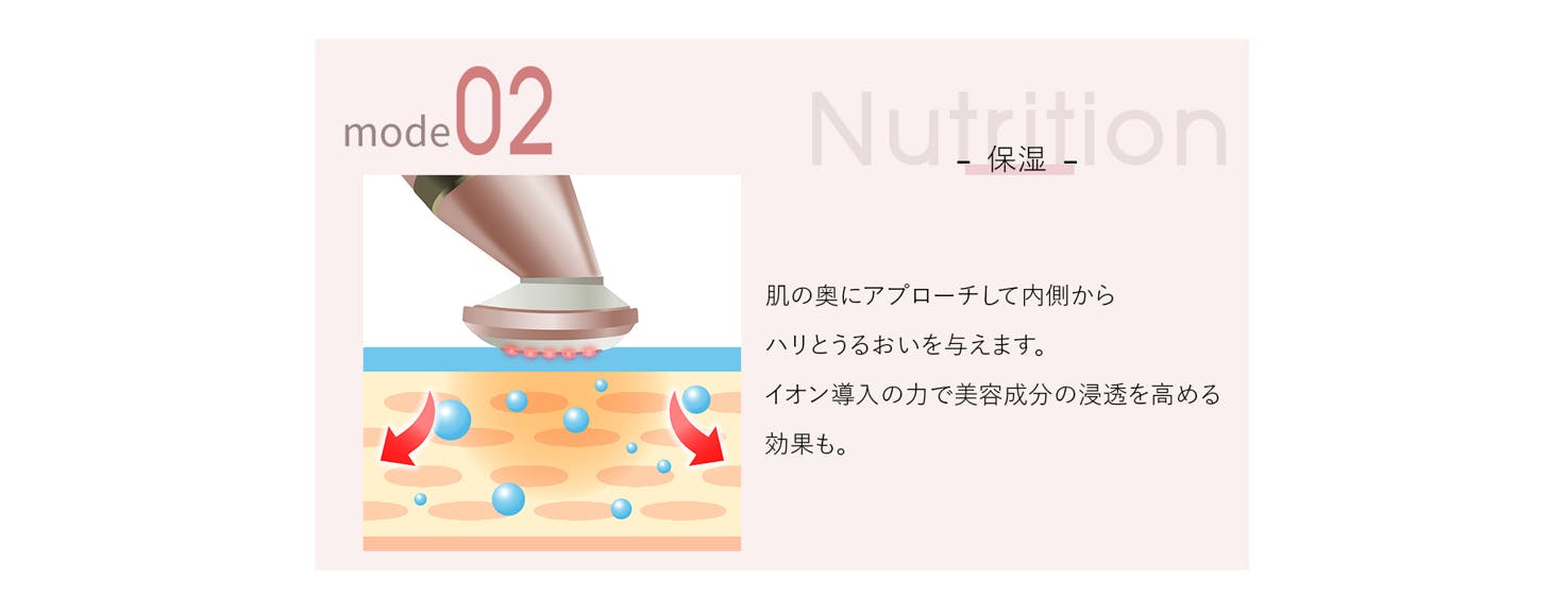 『ラジオ波』により優しい温感で肌を心地よく包み込み、内側からイキイキとした印象に導き肌が本来持つリズムをサポートします。『EMS』によるリフトケアでハリ感のある肌印象へ、『赤色LED』が肌にアプローチ。ふっくらとしたツヤ肌印象へ導きます。また、『イオン』の力で美容成分を肌の奥まで浸透させます。