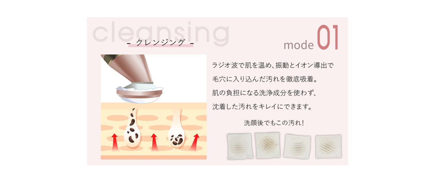 洗顔後、RF(ラジオ波)で肌を温め、バイブレーションとイオンの働きで、肌に残った汚れを優しく浮かせるようにアプローチ、洗顔では落としきれなかった汚れもコットンで優しく拭き取り。