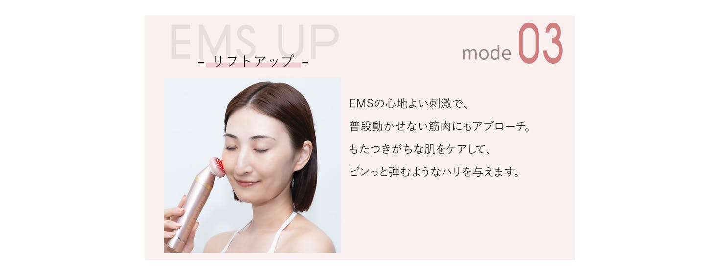 『ラジオ波』により優しい温感で肌を心地よく包み込み、内側からイキイキとした印象に導き肌が本来持つリズムをサポートします。『EMS』によるリフトケアでハリ感のある肌印象へ、『赤色LED』が肌にアプローチ。ふっくらとしたツヤ肌印象へ導きます。