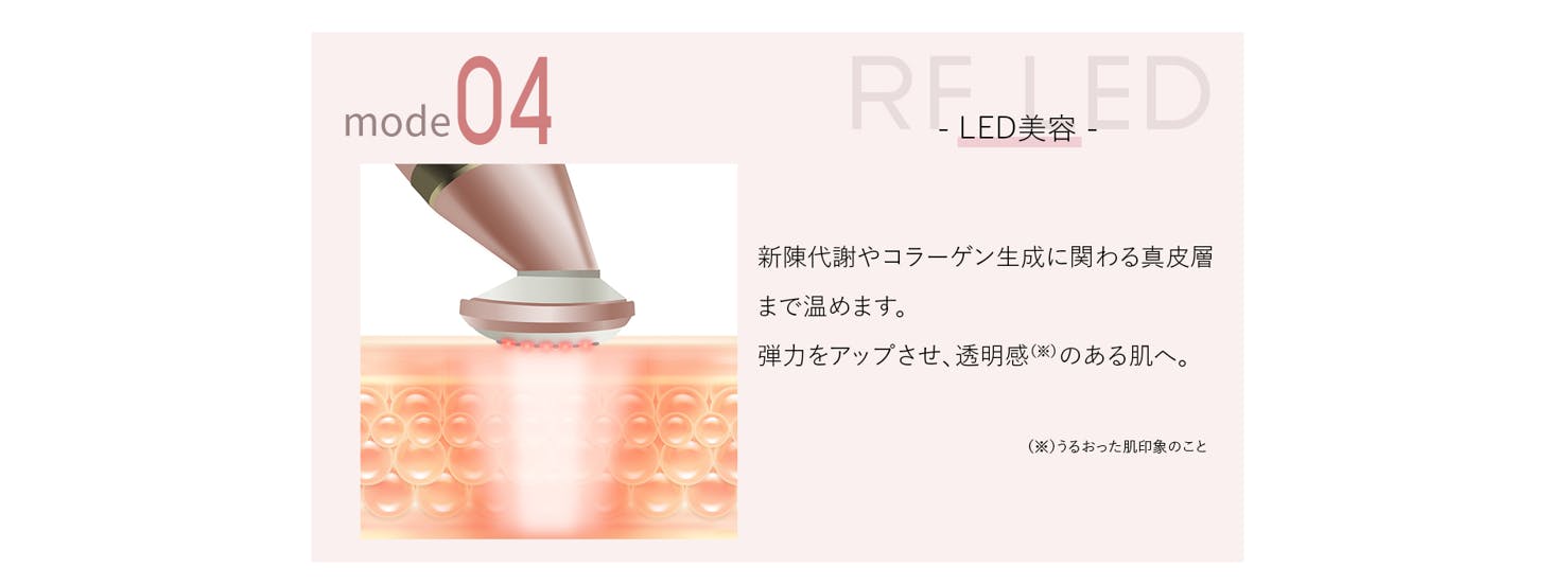 『ラジオ波』により優しい温感で肌を心地よく包み込み、内側からイキイキとした印象に導き肌が本来持つリズムをサポートします。『赤色LED』が肌にアプローチ。ふっくらとしたツヤ肌印象へ導きます。