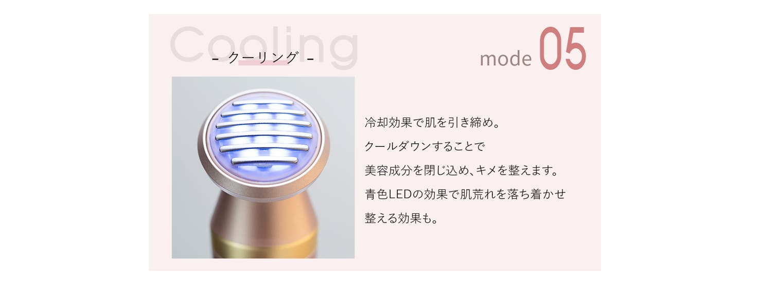 冷却機能で肌を引き締めて、クールダウンすることにより、美容成分を閉じ込め、整った肌へと導きます。 また、『青色LED』は、肌をクールダウンしすっきりと整え毛穴が目立ちにくい肌印象へ。また、肌を健康に保ち健やかな状態へ導くケアです。