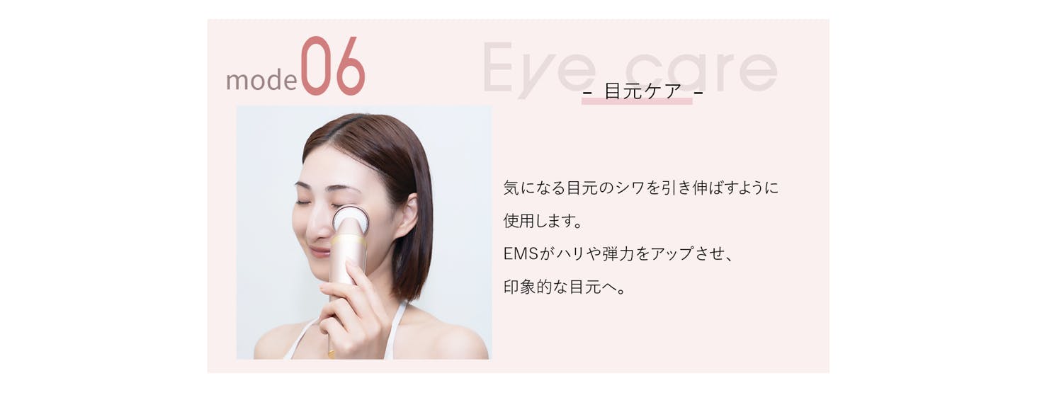 『ラジオ波』により優しい温感で肌を心地よく包み込み、内側からイキイキとした印象に導き肌が本来持つリズムをサポートする温感ケア。 さらに『EMS』のマイクロカレント(微弱電流)モードにより目元をすっきりとした印象に導き、ハリ感のある肌へ。