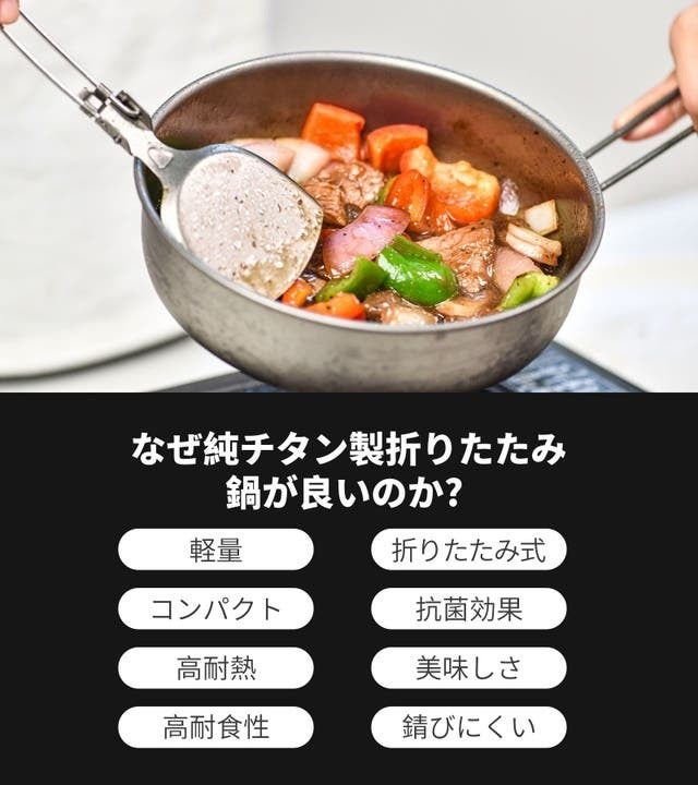 超軽量&折りたたみ式設計で持ち運びも楽に出来て、99.9%純チタン製で強度が強く腐食しずらい素材で、金属臭が感じずらく、食べ物の素材の風味を落としづらくしてくれます。