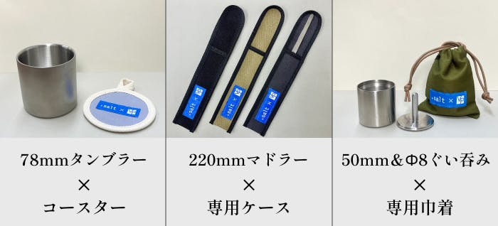 78mmタンブラー×コースター、220mmマドラー×ケース、50mm&Φ8ぐい吞み×巾着の3つのセットをリターンとしてご用意しております。