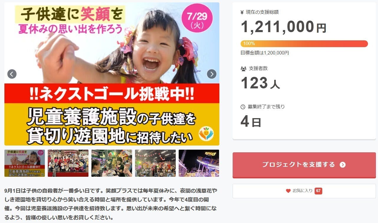 笑顔プラスです【児童養護施設の子供達に、笑顔とふれ合いの夏休みの思い出を作りたい!】とうとう明日が最終日になりました。24の児童養護施設で488人の参加希望者がおり現在約150名程のご招待枠になります。各児童養護施設でイベントを呼びかけ参加したい子供達が名乗りをあげているのできっと皆夏の遊園地を楽しみにしているだろうと思います。できたら全員ご招待できたらいいのに・・初年度は全額私財で開催しました翌年以降もクラファンや寄付等で200名の不足分は私財で賄ってきております。今年も私個人で出来る事は精いっぱいいたしますが1人でも多くご招待したいので皆様のお力をお貸しください。こちらのクラウドファンディングをお知り合いやsnsでシェアしていただけたら嬉しいです。最後まで頑張ります!よろしくお願い致します。一般社団法人笑顔プラス子供支援協会代表理事加藤ミサ