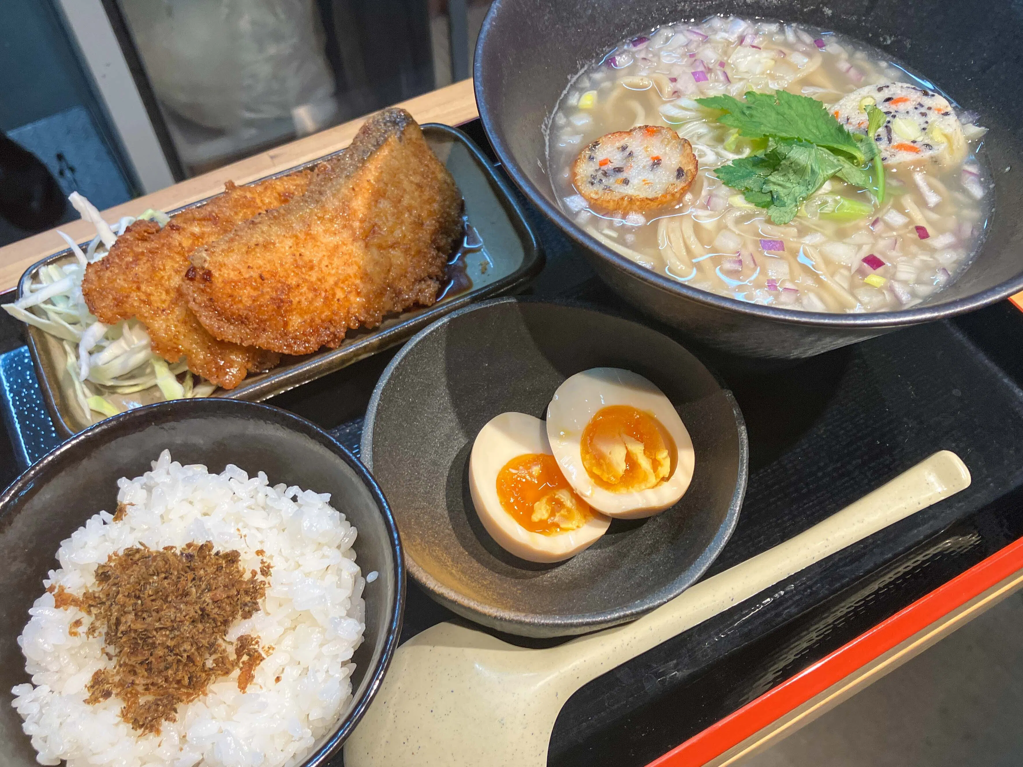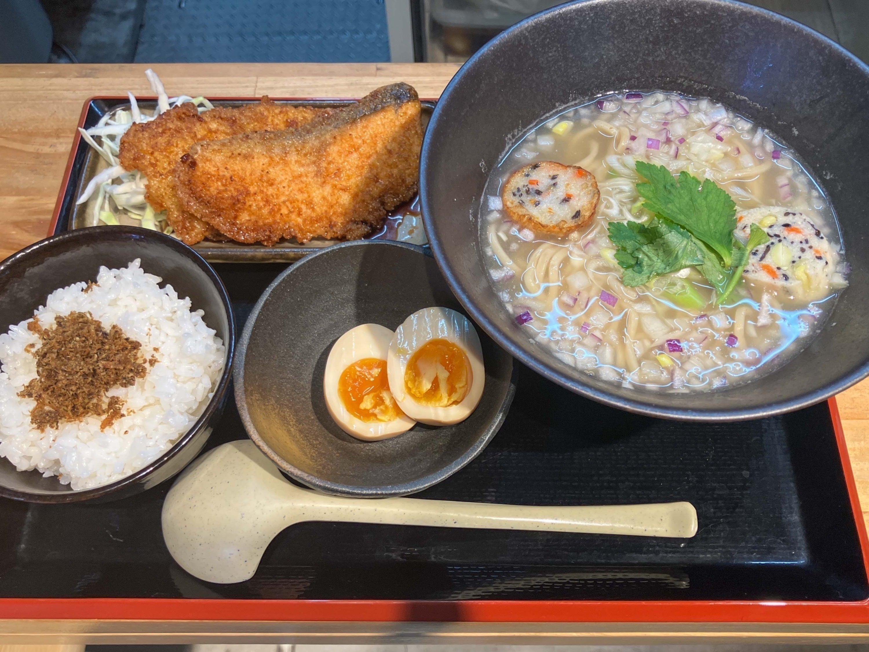 4、CAMPFIRE限定 朝ラーメン定食|3000円|定食内容:自家製ふりかけご飯、特製味玉、えびのタレカツ、鮭のタレカツ