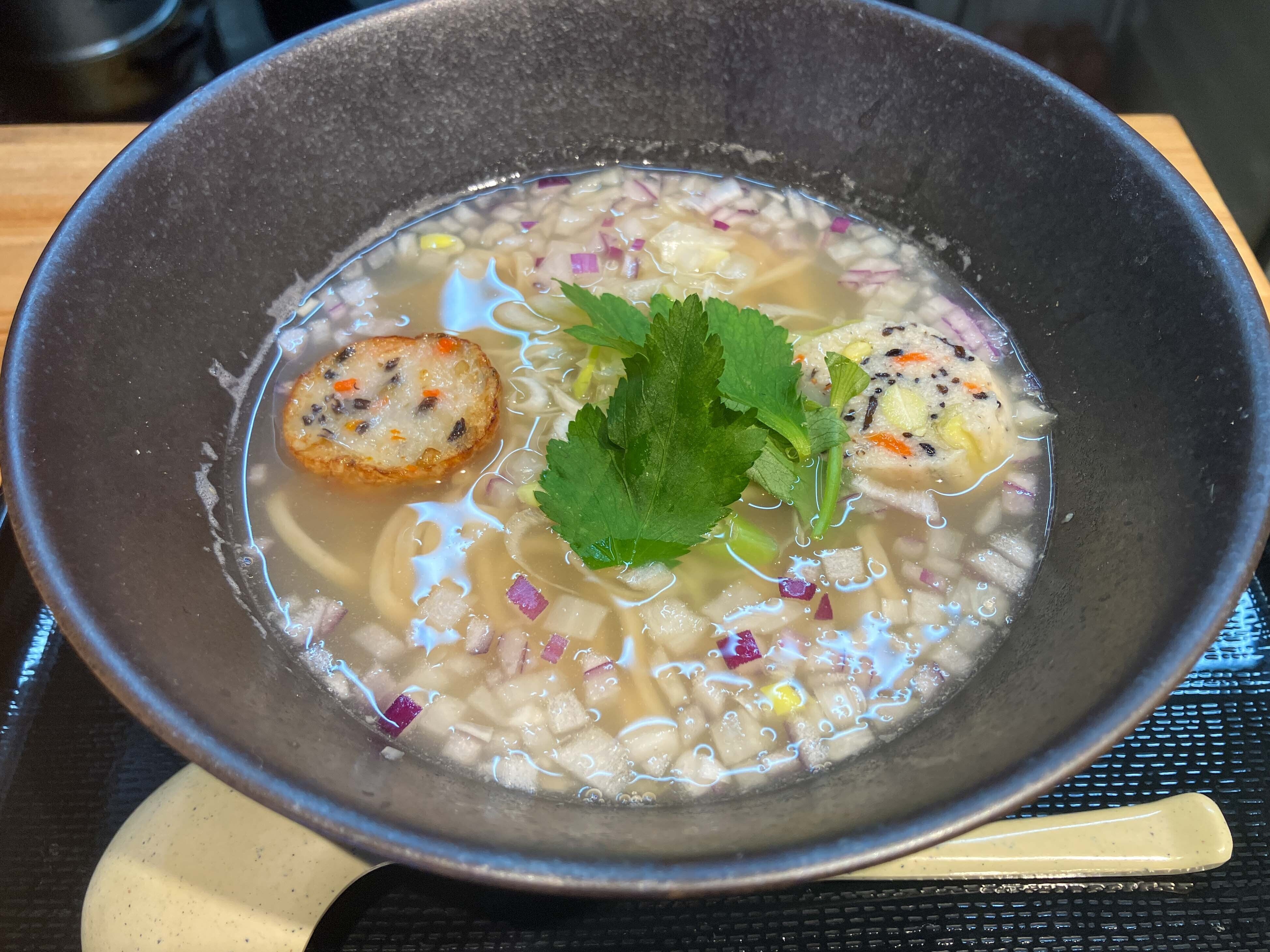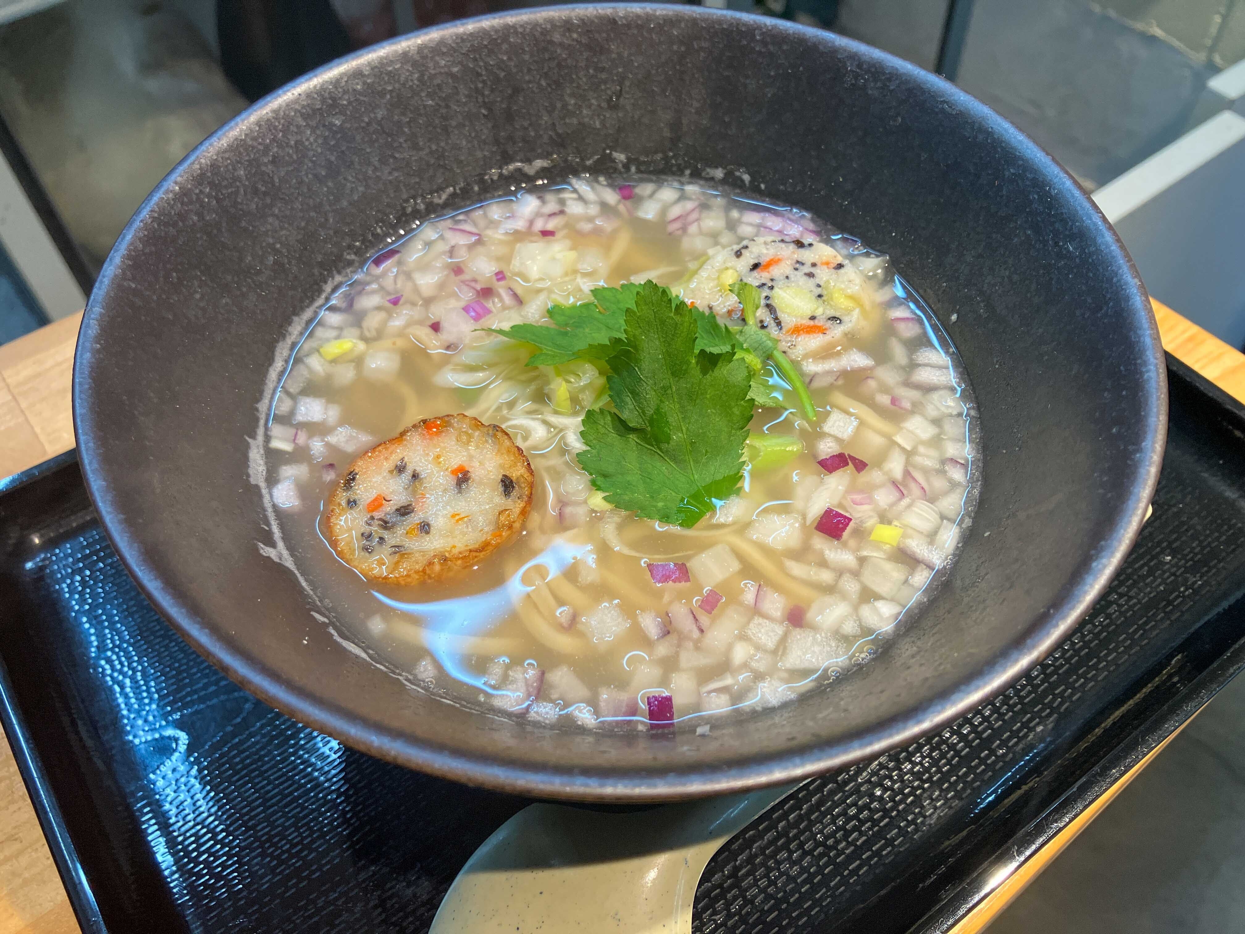 自家製の「さつま揚げ」と「おからしんじょう」をトッピング。おからも同じく市場内で営業されている豆腐屋のおからを使用して、アラ塩ラーメン専用のトッピングを考えました。旬魚出汁の塩スープとおからしんじょうでさらにラーメンの優しい味を演出します。