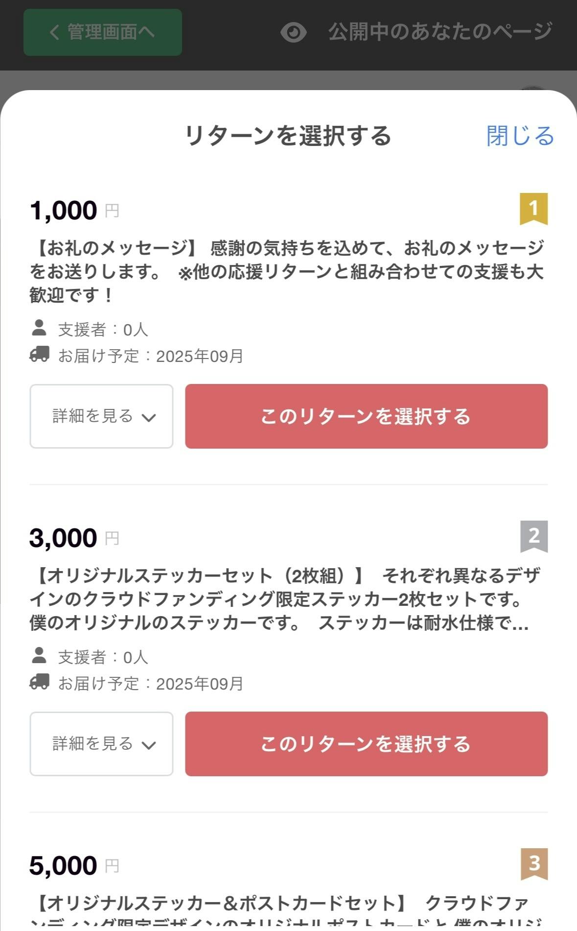 リターンの中から、コースと、数量を選択します!一気に2個3個も選択できます