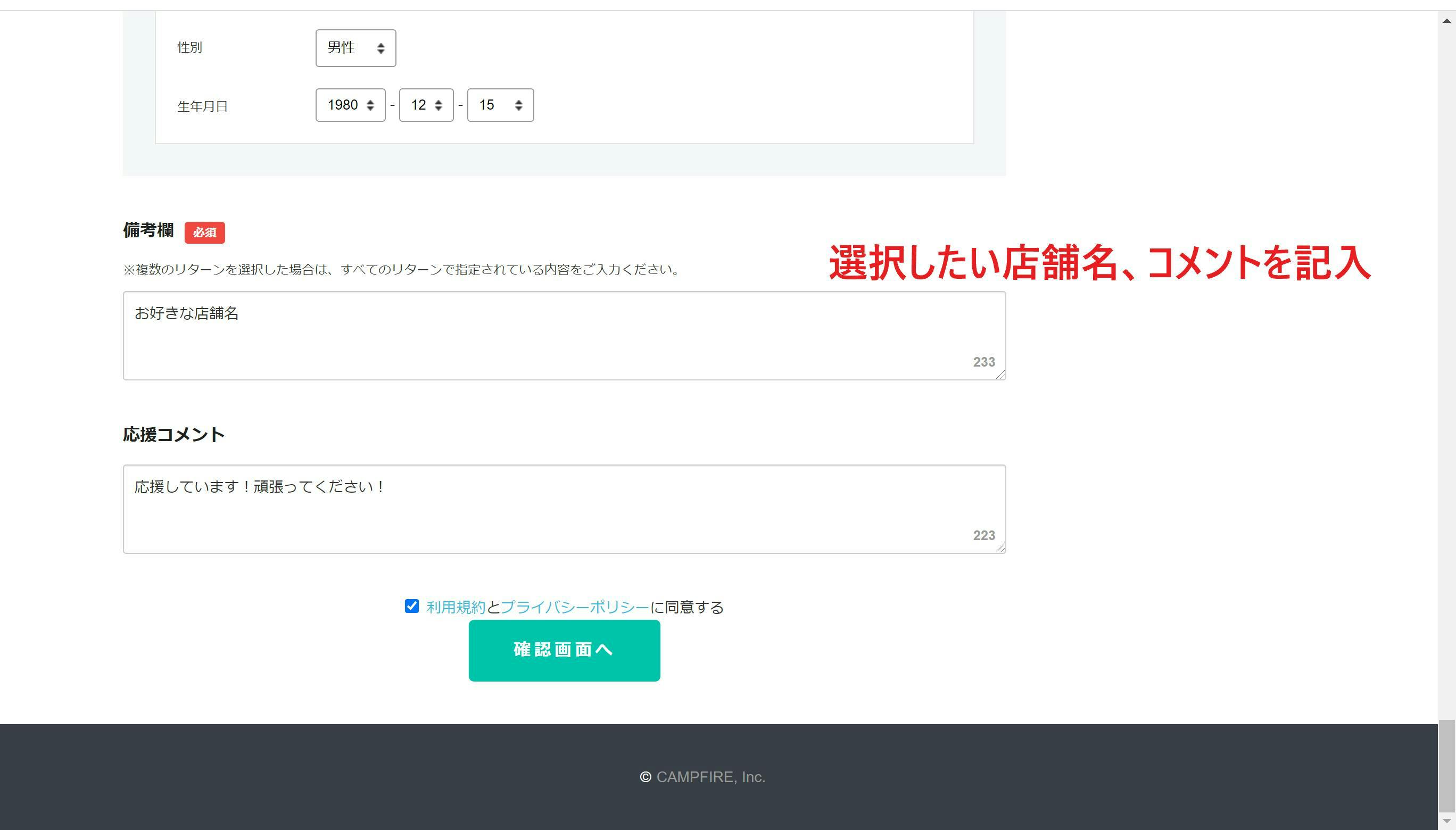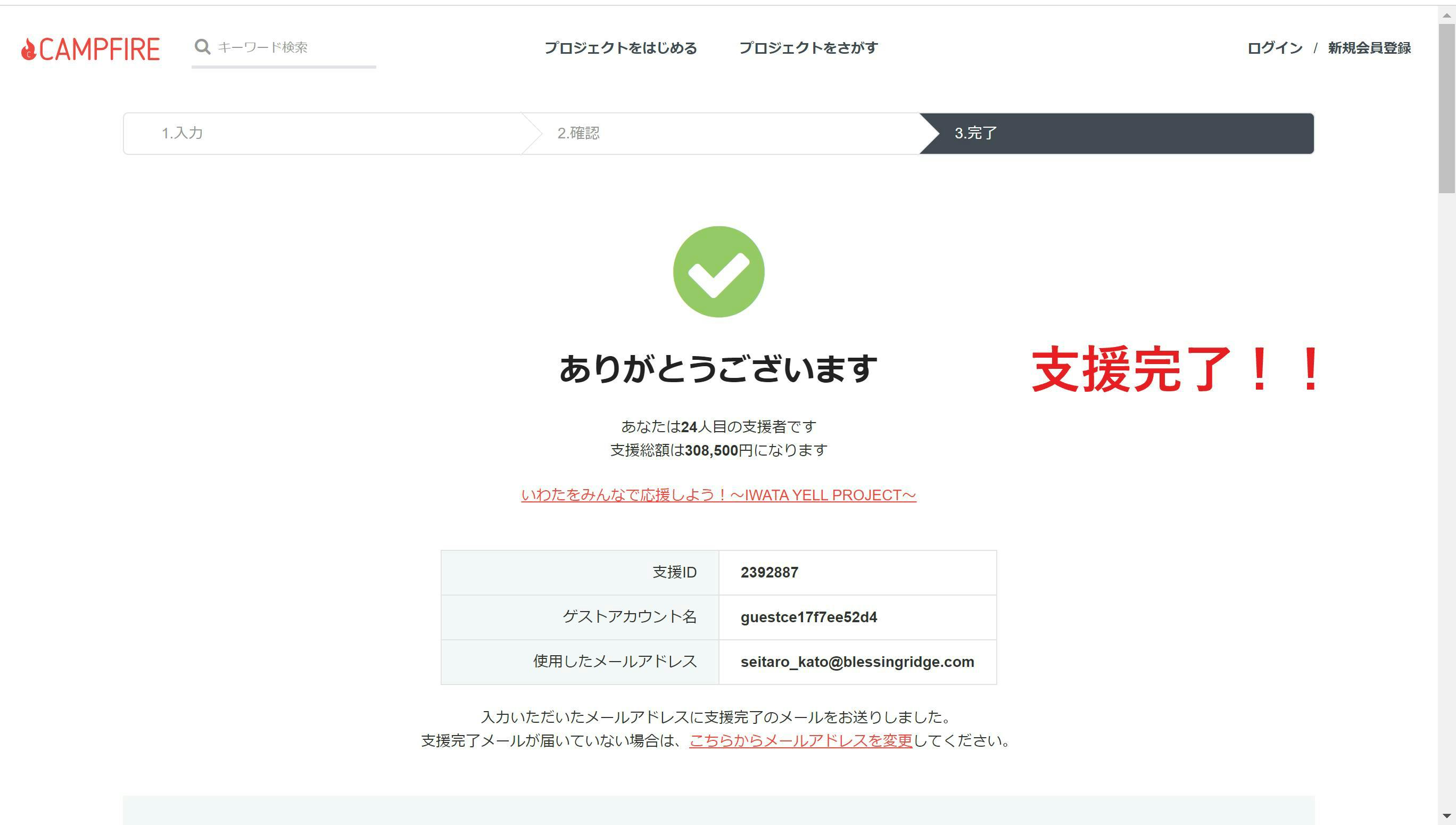 ③メールアドレスの入力と決済方法の選択その際、facebook、LINEなどでログインして支援する方法も選べます。(入力が多少緩和されます)※メールアドレスはキャリアメール以外でお願いします。ドコモの@docomo.ne.jp』、ソフトバンクの『@softbank.ne.jp』、auの『@ezweb.ne.jp』などは支援完了など案内が届かない恐れがあります。