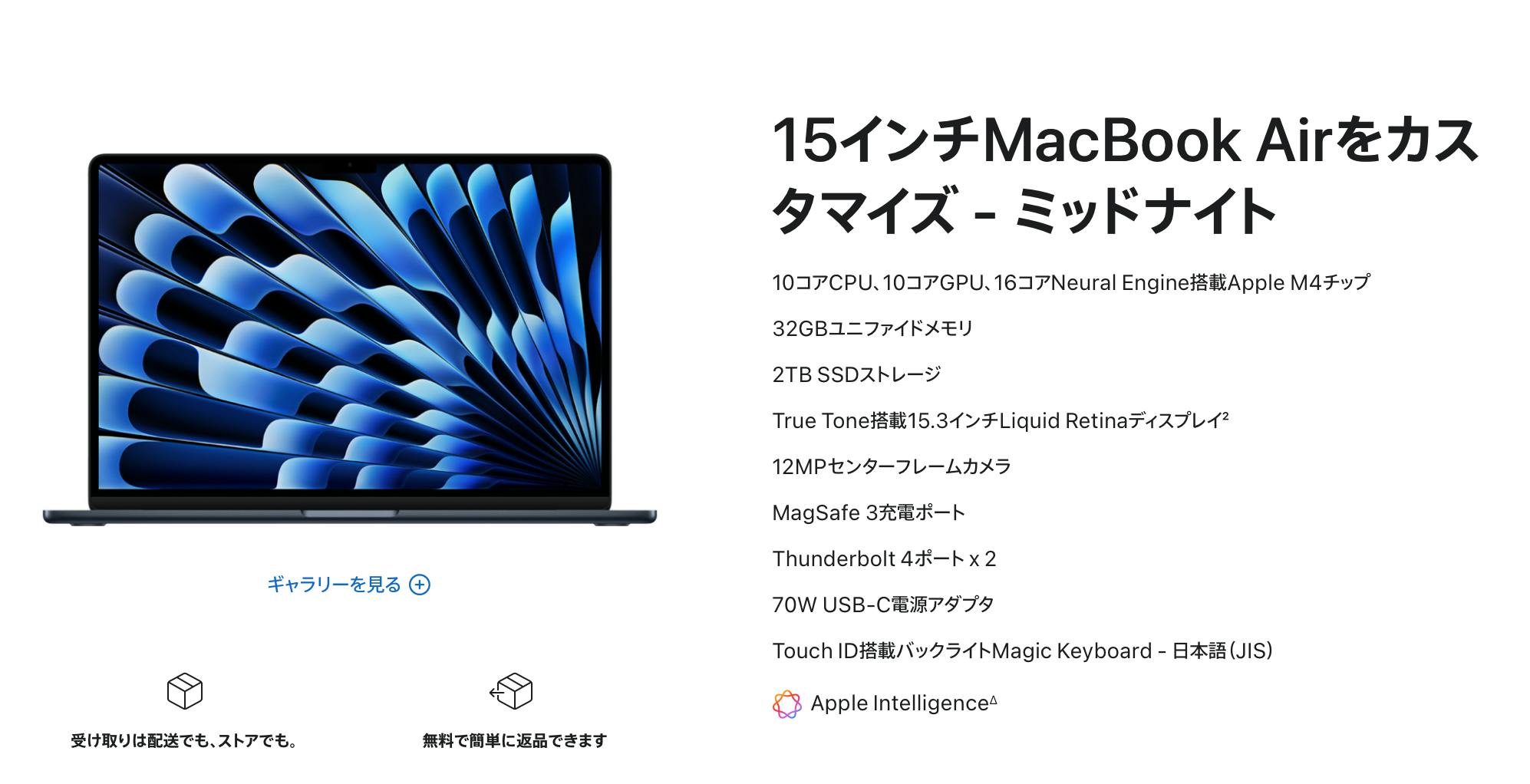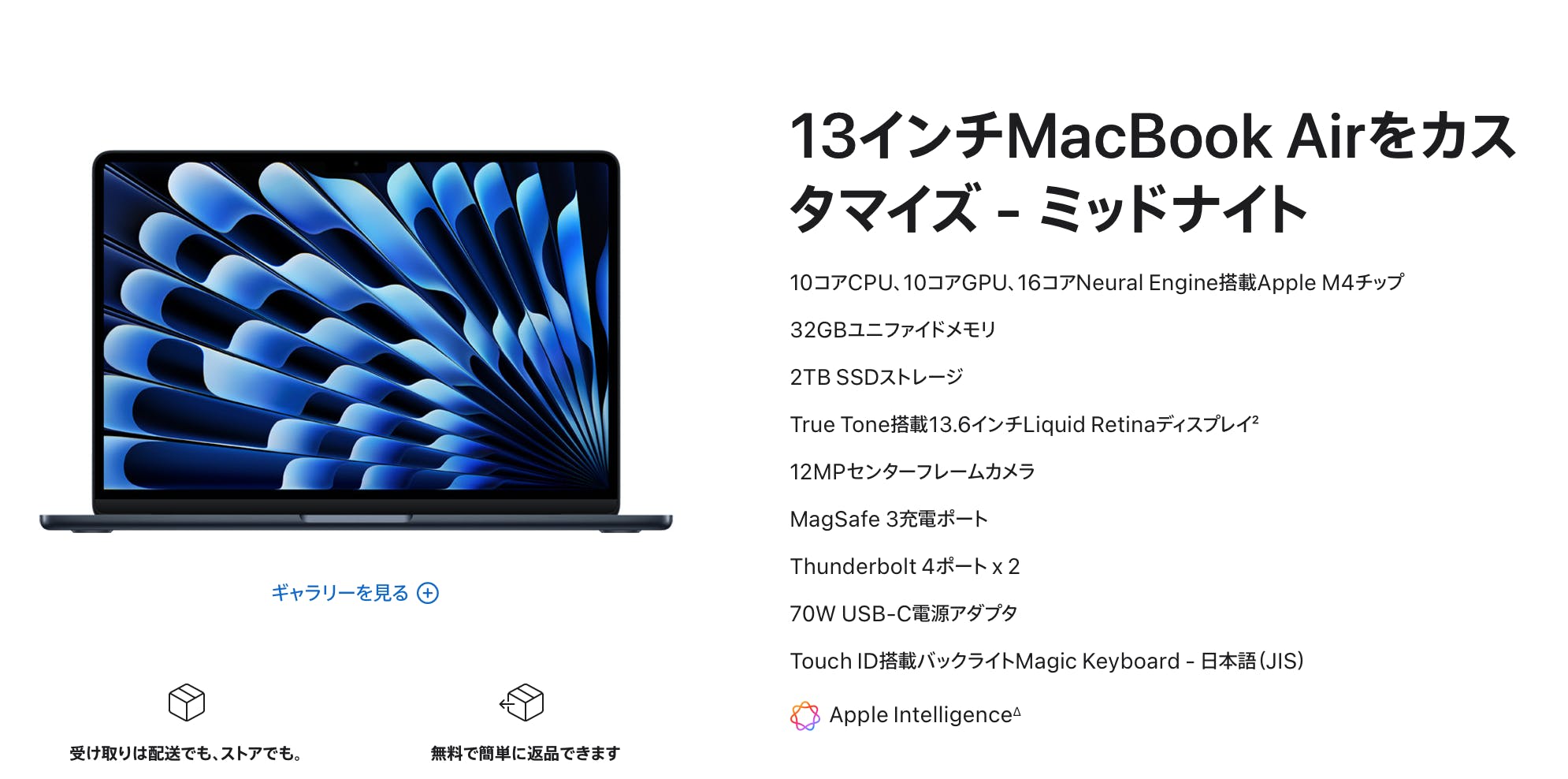 おかげでMacBook Air M4の新品を思い通りのカスタマイズで入手できそうです。