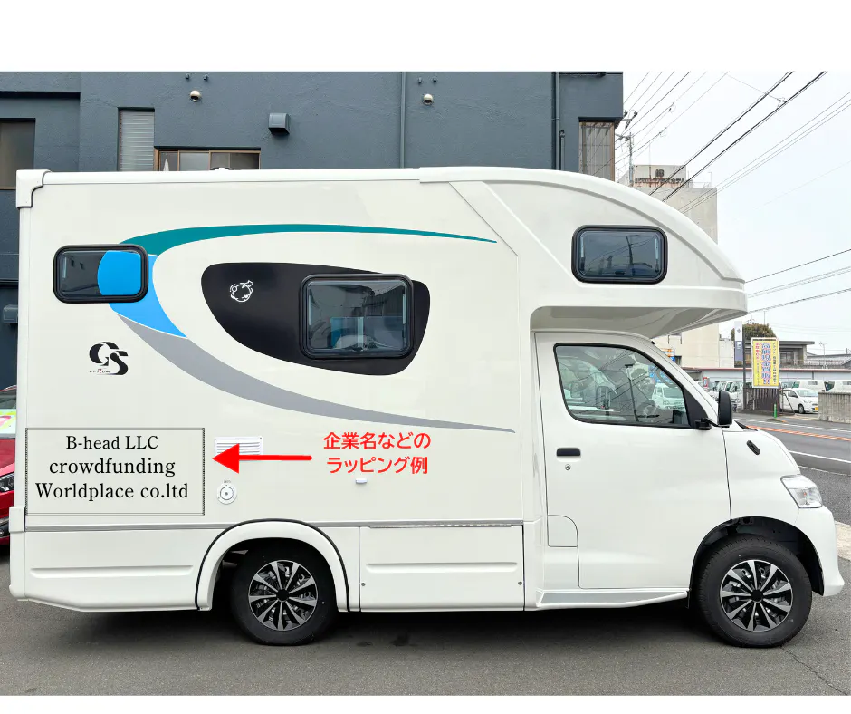 ※キャンピングカー外装への社名orロゴのラッピングについて、キャンピングカーのイメージとあまりにミスマッチが起こる場合(漢字のみなど)は大変恐れながらデザインの変更をお願い、もしくは支援金を一部返還させていただく場合がございます。