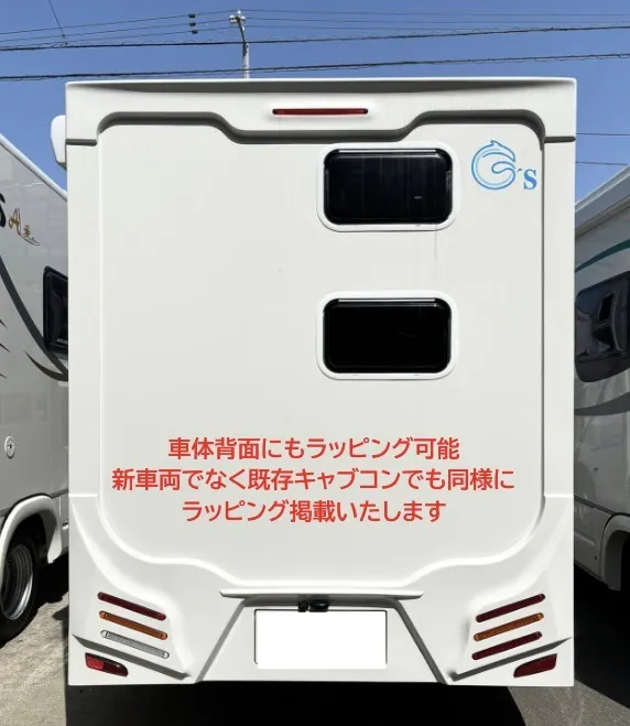 ・キャンピングカー外装に大サイズの社名、もしくは中サイズのロゴ+社名をラッピング掲載