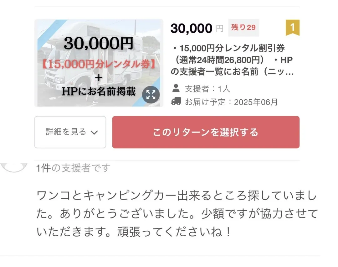 2025/05/09 02:56わーるどぷれいすの佐藤です。今日の昼間、ポケットの中で着信がありメールを開いてみるとそこには、【支援者が現れました】の文字が!!ここまで「嬉しい」と心から思ったのはいつぶりか想像もつきません。妻はもはや泣いていました。実はプロジェクトの公開そのものは僕の完全なミスにより5日ほど前にされており、皆さまへの告知前から始まってしまっていたのです。もう本当にミスだらけで情けない限りでした。告知もできていない状態なので当然ご支援も賜ることもなく、そこからのようやく昨晩に公開告知でした。正直この数日間は全く行きた心地がせず、ネガティブな感情ばかりが募る一方でした。「誰にも見られていないのではないか」「全く必要されていないのではないか」冒頭の「嬉しい」感情と同じくらい数年に一度レベルの「不安・落ち込み」がありましたので落差が半端ではありません。もうこのクラファンのことで軽く10年分ぐらいの精神の波を経ています。そんな中での1人目のご支援は、僕たちに限りない希望をもたらしてくれました。大袈裟ではなく、心から救われました。その後個別メッセージにてお礼をお送りさせていただきました。今回ご支援いただきました内容がこちら。本当にありがとうございます。リターン(ご支援に対する返礼品)には当店でお使いいただけるレンタル割引券はもちろん、ご支援者さま一覧という形でHPや車内にお名前を掲載させていただきます(ニックネーム可)掲載の期限はございませんので、未来永劫(事業が存続する限り)皆さまと一緒に作りあげたプロジェクトであるということが形に残ります。どうか、皆様のお力をお貸しください。ご期待に応えられますよう、人生をかけてこの事業に取り組んで参ります。それでは引き続き、よろしくお願い申し上げます。わーるどぷれいす佐藤 清之介 もっと見る