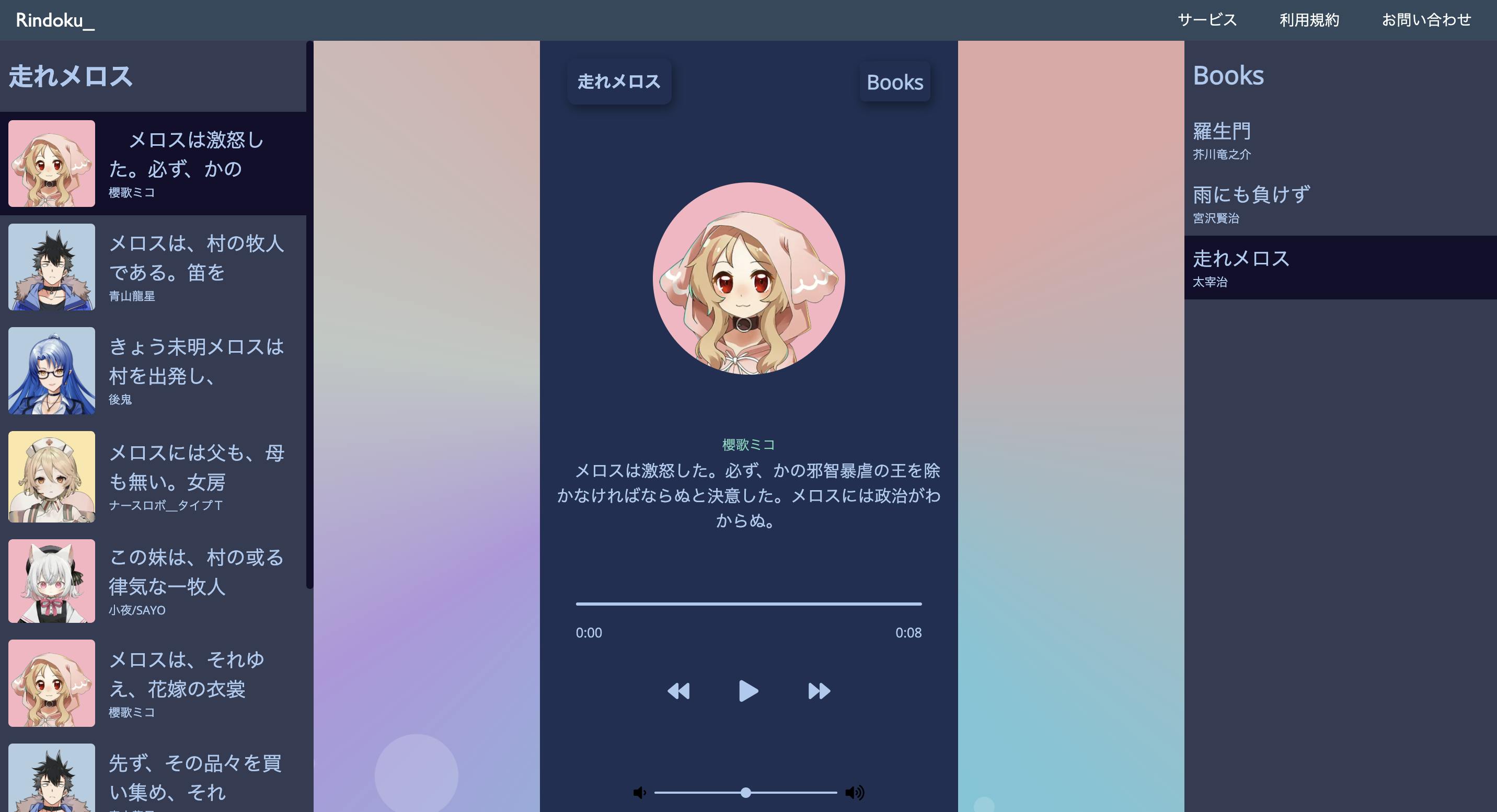 Webサービス『Rindoku_』は、ずんだもんをはじめとする個性豊かなキャラクターが青空文庫の文学作品を順番に朗読していくオーディオブックです。https://rindoku.org/