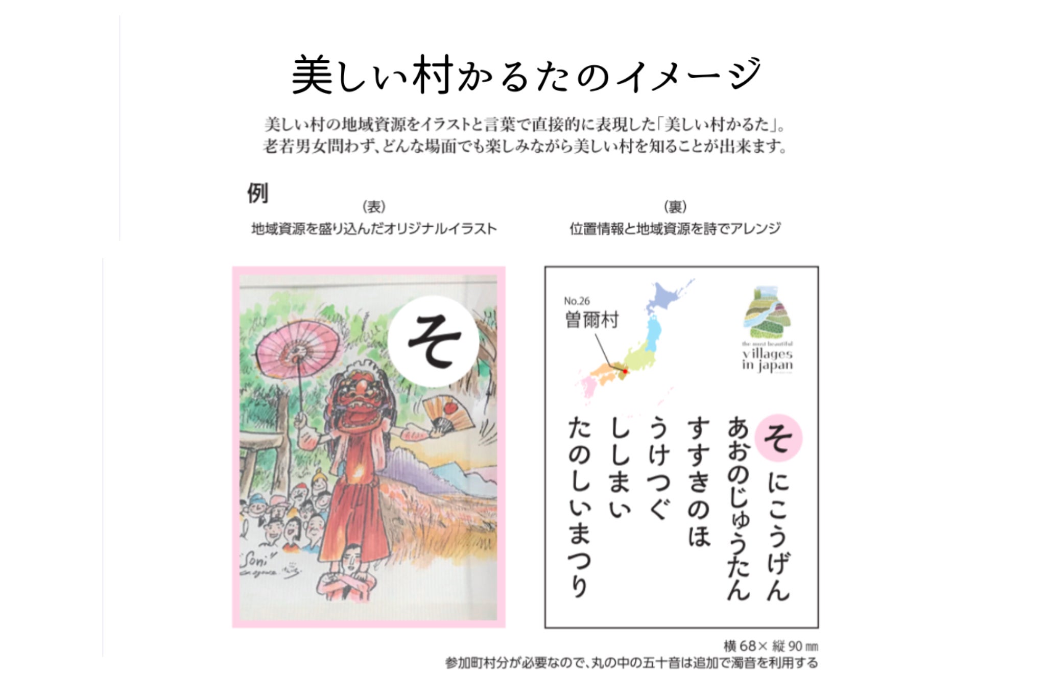 私たち、NPO法人「日本で最も美しい村」連合は、設立20周年を記念して、加盟町村・地域の魅力を表現したかるた制作プロジェクトを立ち上げました。最大の特徴は、加盟する町村・地域の住民の皆さんと一緒に作り上げていることです。