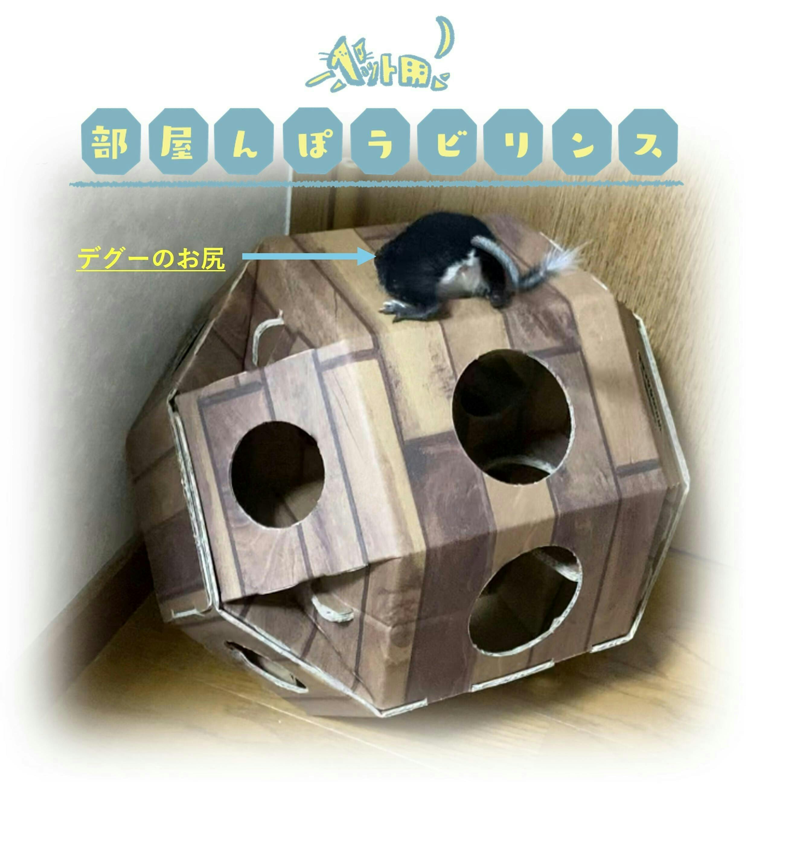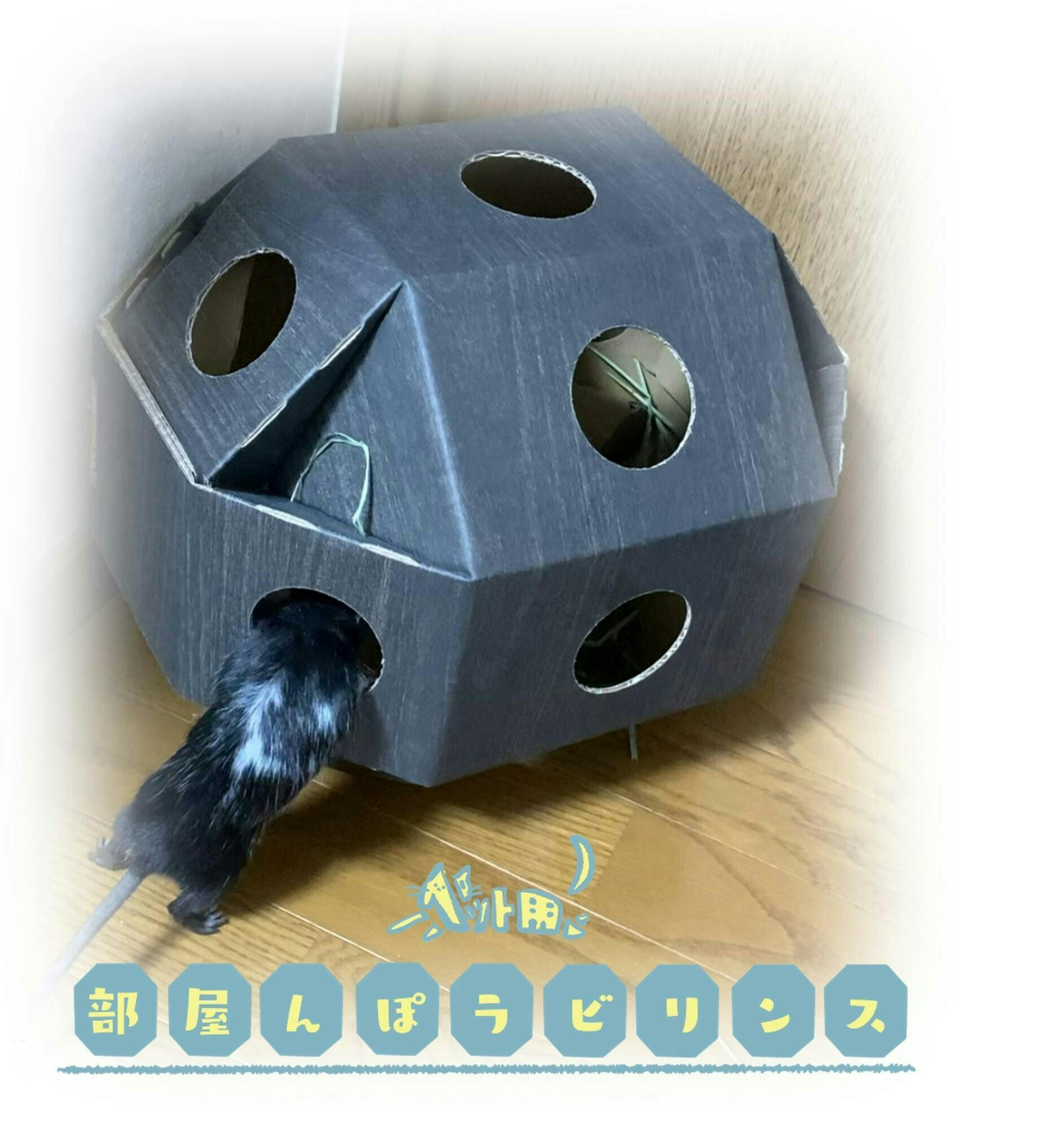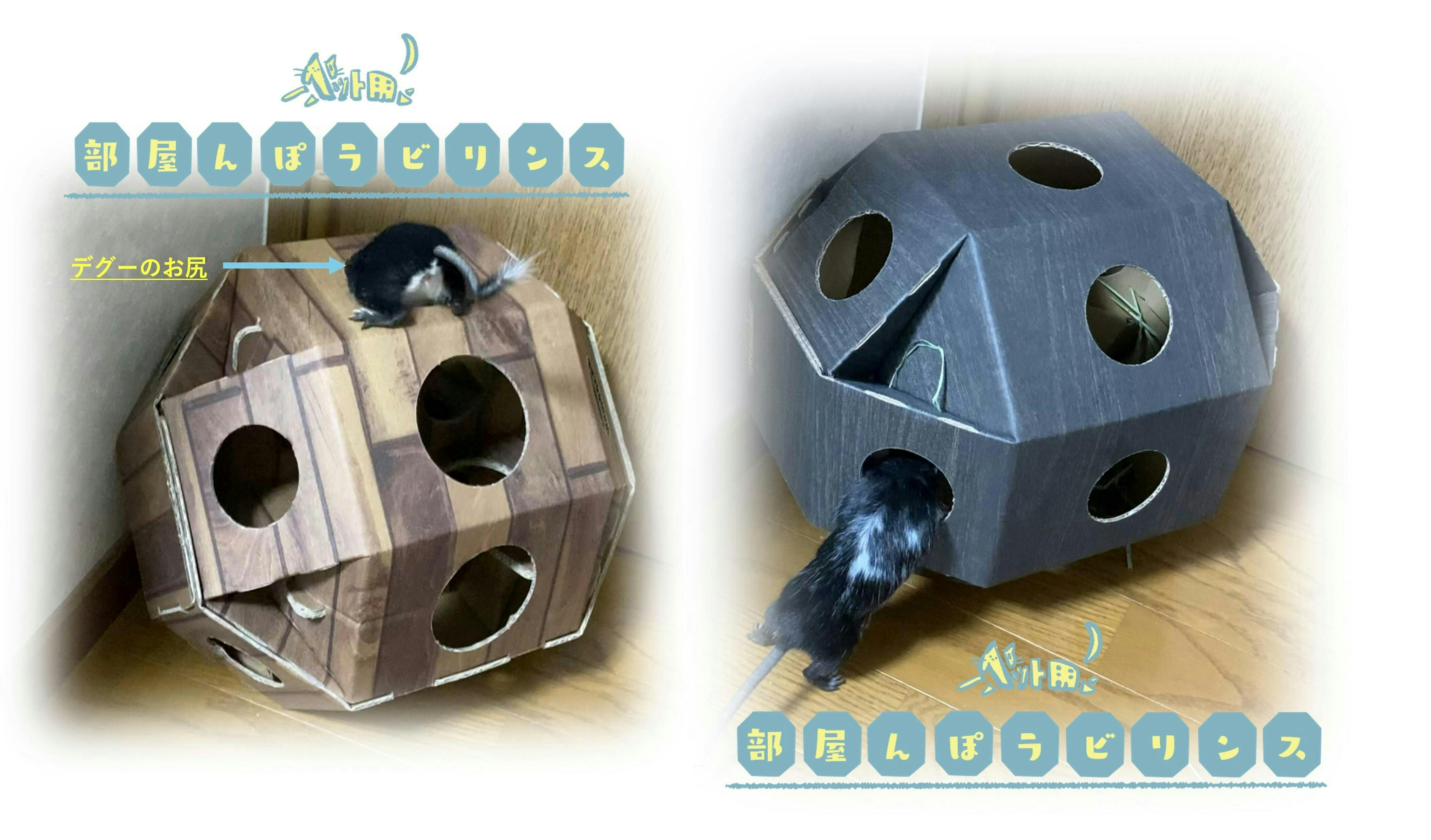 ペットの小動物をお部屋の中で散歩させる「部屋んぽ」は、ストレス解消や運動不足に繋がり健康を促進します。そして「部屋んぽラビリンス」は、部屋んぽに更なる楽しみを創出できるユニークな段ボールアイテムです。使用用途は、巣箱・牧草入れ・遊具・踏み台など多岐にわたり、16か所の開口部から「部屋んぽラビリンス」内へ入ることができます。