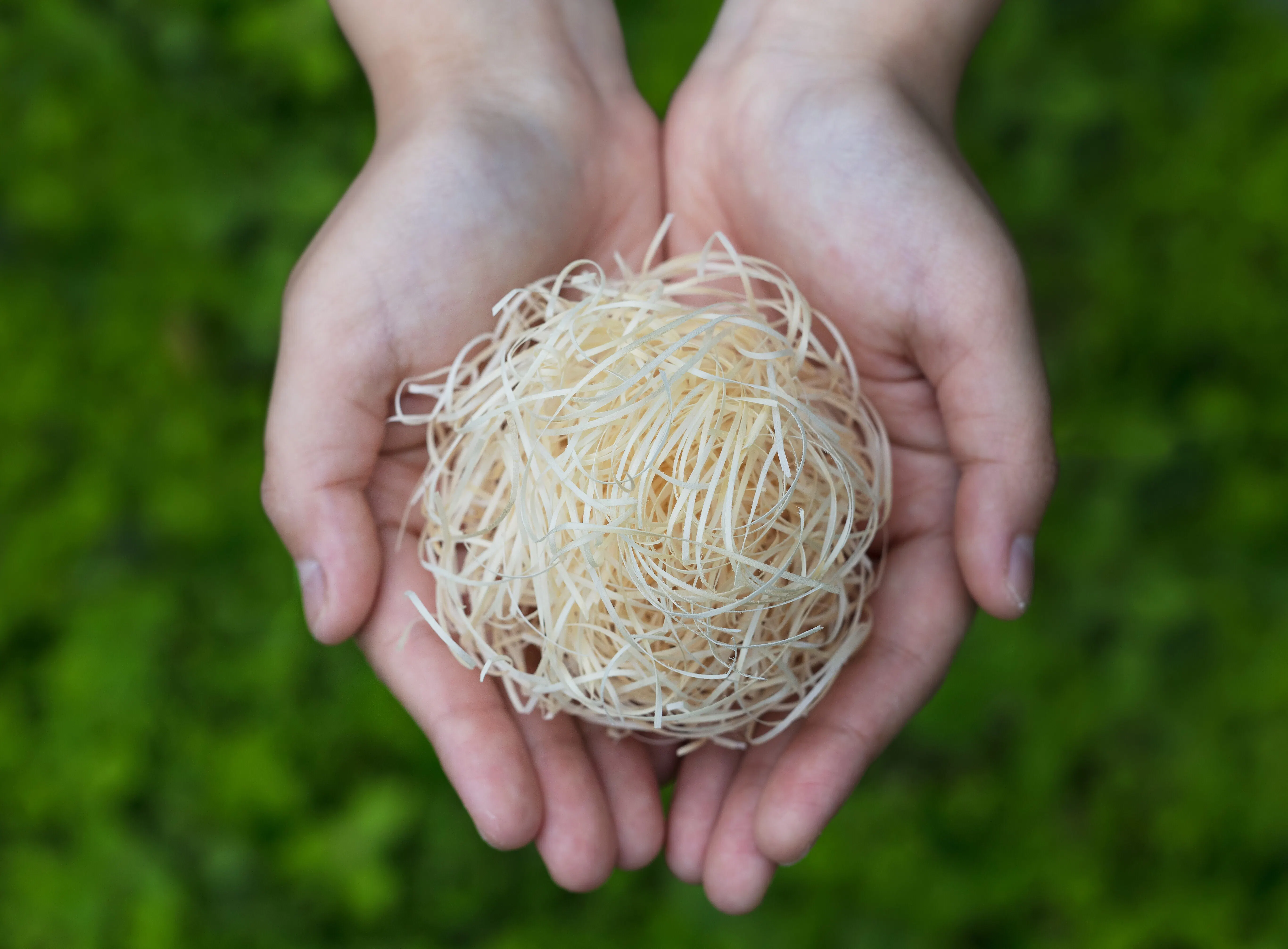 木毛(もくめん)は、松や檜などの国産木材を細く削って作る天然の緩衝素材