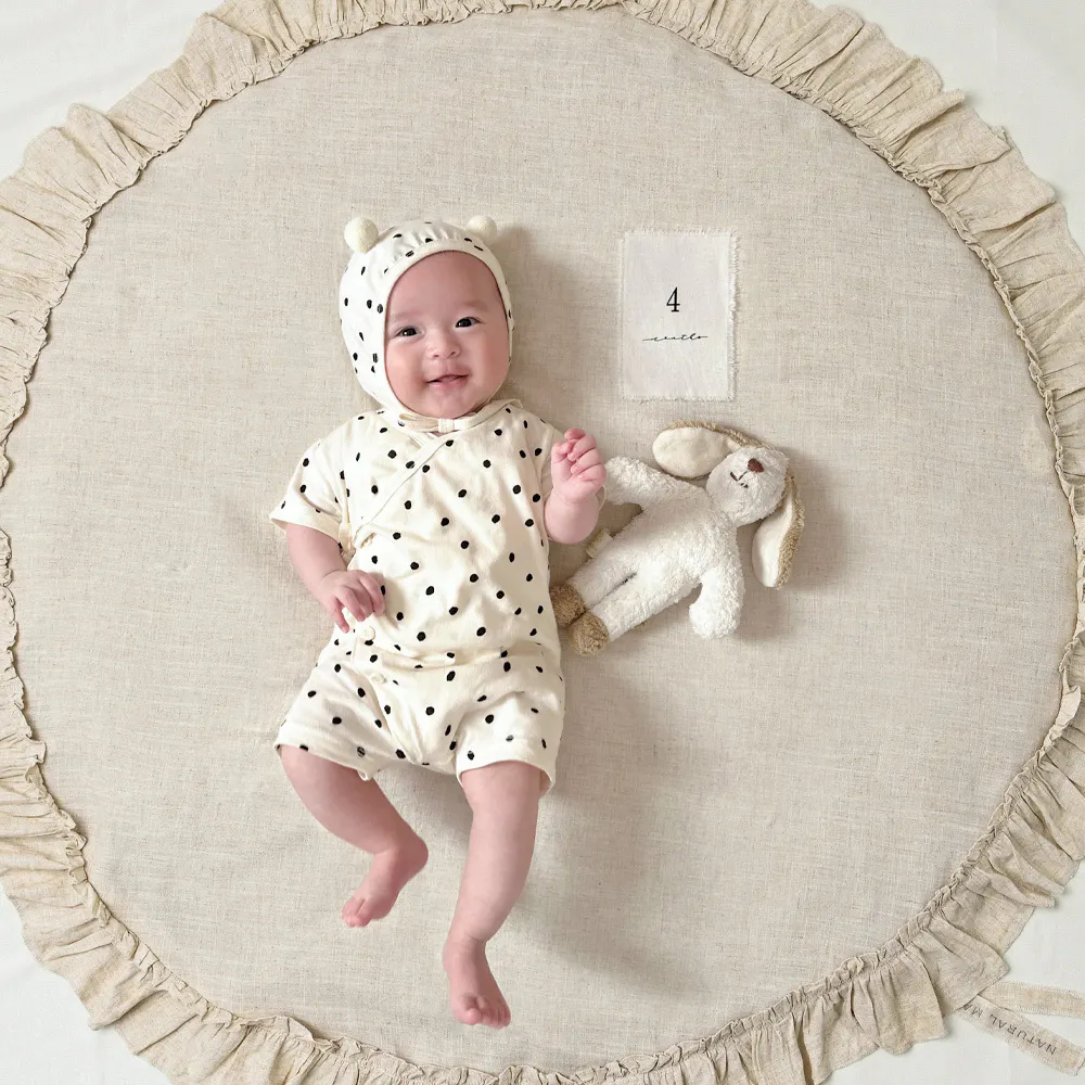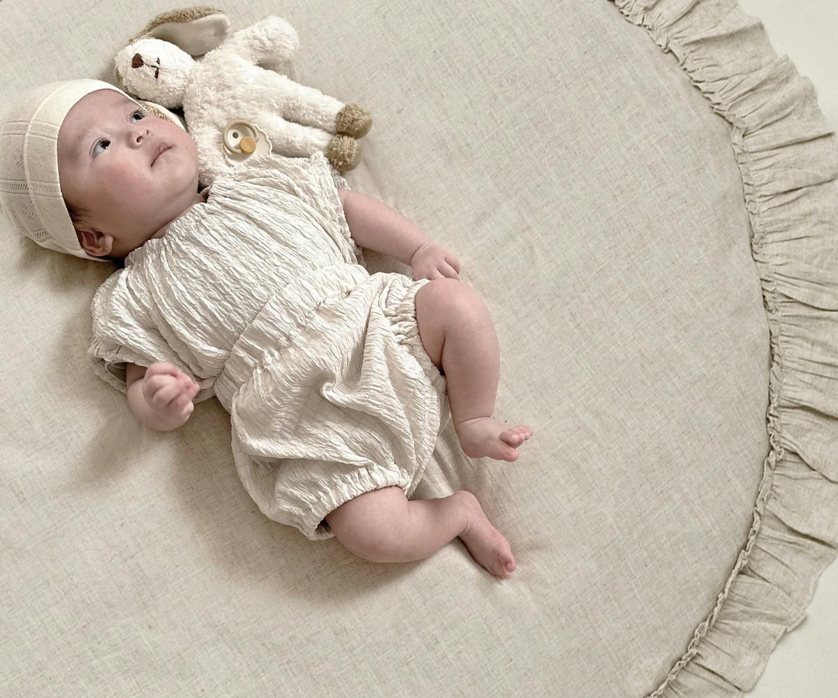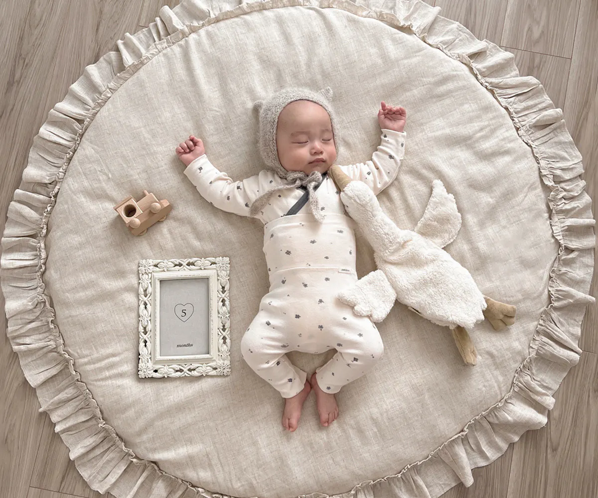 赤ちゃんを寝かせたり、おむつ替え、遊び時間のプレイマット、 子ども部屋のアクセントラグとしても使える万能アイテム。 お気に入りのぬいぐるみやカードと一緒に、 月齢フォトにも映える、おしゃれな空間を演出できます。