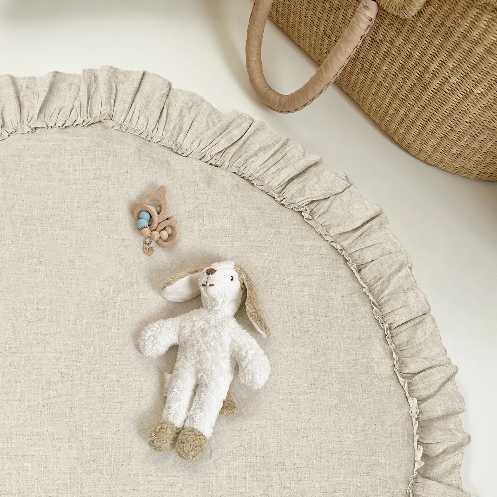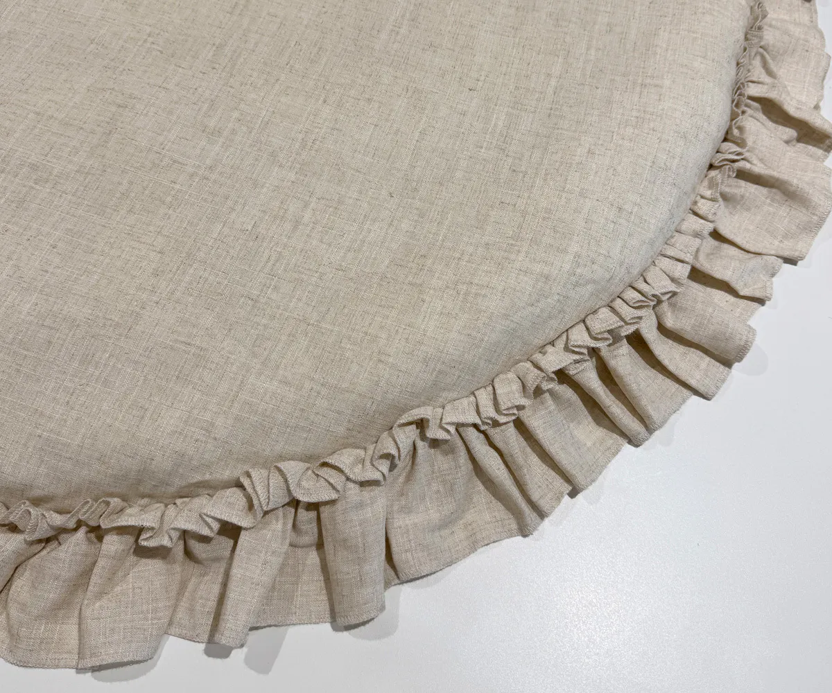 そこで、ホワイトやベージュ系の淡いカラーインテリアが好きなママにぴったりな、見ているだけで気分の上がるリネン混素材のありそうでなかったラウンドマットを作りました。