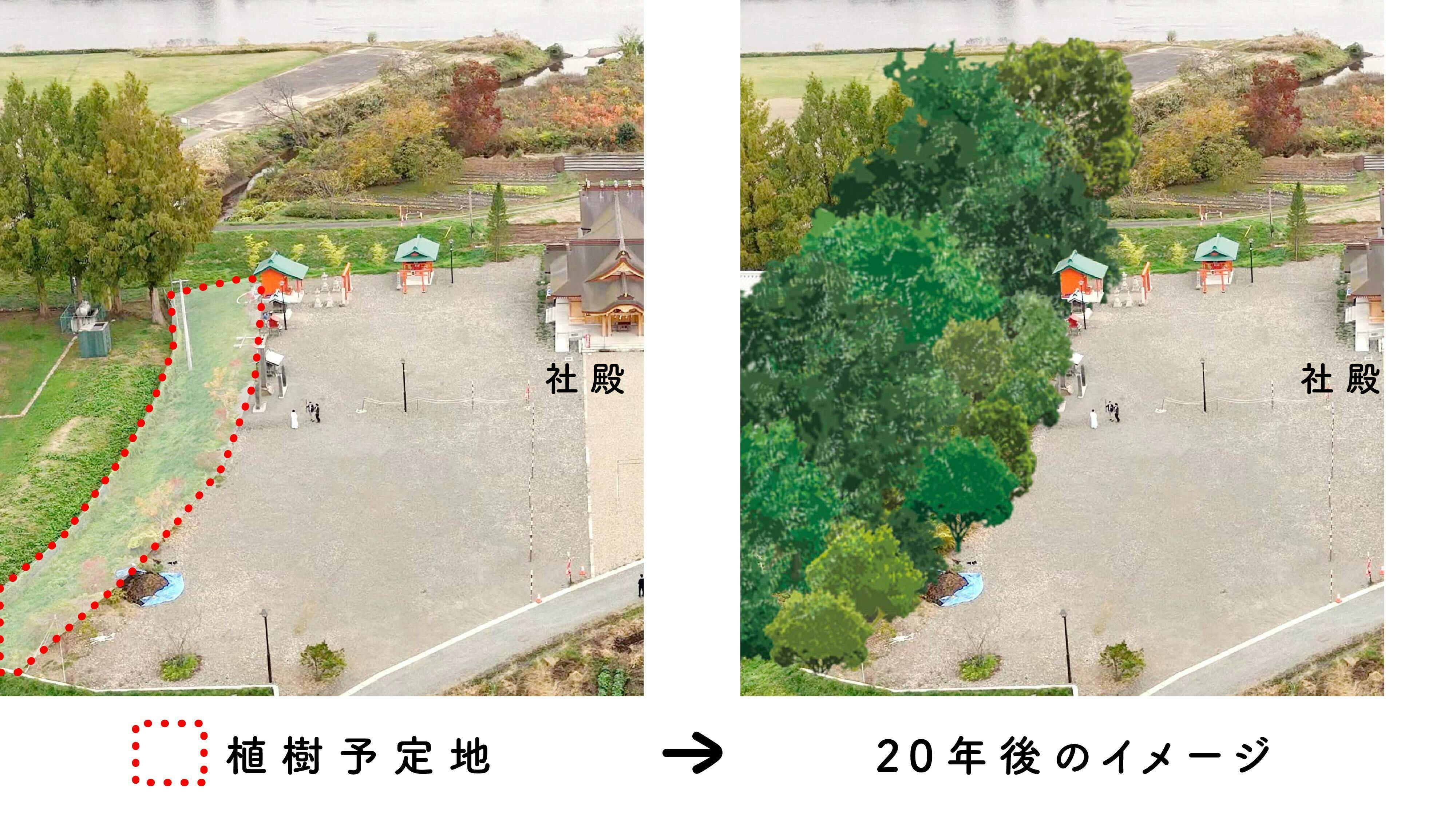 長きに亘り神聖な場所に鎮座した神社の移転は誰もが「断腸の想い」ではありましたが、平成30年に国が進める治水事業に協力し、神社は内陸へと全面移転することを決定しました。その結果、令和3年12月に新境内地に遷座されましたが、旧境内の鎮守の杜は移転できず消滅してしまったのです。